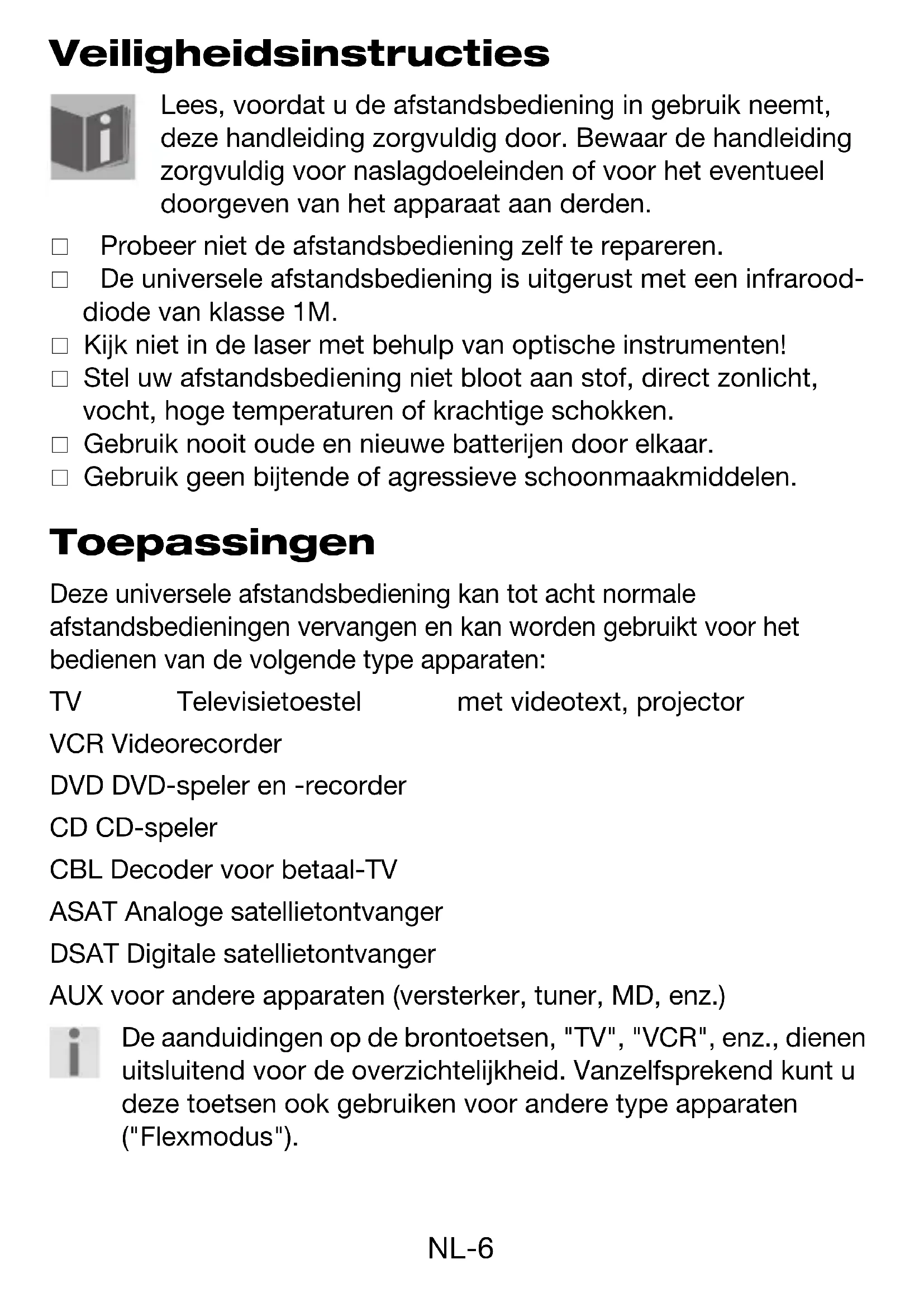 - Technische gegevens Universal-FB MD 80383 BE.book Seite 5 Donnerstag, 4. August 2005 5:39 17NL-6 Veiligheidsinstructies Lees, voordat u de afstandsbediening in gebruik neemt, deze handleiding zorgvuldig door. Bewaar de handleiding zorgvuldig voor naslagdoeleinden of voor het eventueel doorgeven van het apparaat aan derden. Probeer niet de afstandsbediening zelf te repareren. De universele afstandsbediening is uitgerust met een infrarood- diode van klasse 1M. Kijk niet in de laser met behulp van optische instrumenten! Stel uw afstandsbediening niet bloot aan stof, direct zonlicht, vocht, hoge temperaturen of krachtige schokken. Gebruik nooit oude en nieuwe batterijen door elkaar. Gebruik geen bijtende of agressieve schoonmaakmiddelen. Toepassingen Deze universele afstandsbediening kan tot acht normale afstandsbedieningen vervangen en kan worden gebruikt voor het bedienen van de volgende type apparaten: TV Televisietoestel met videotext, projector VCR Videorecorder DVD DVD-speler en -recorder CD CD-speler CBL Decoder voor betaal-TV ASAT Analoge satellietontvanger DSAT Digitale satellietontvanger AUX voor andere apparaten (versterker, tuner, MD, enz.) De aanduidingen op de brontoetsen, "TV", "VCR", enz., dienen uitsluitend voor de overzichtelijkheid. Vanzelfsprekend kunt u deze toetsen ook gebruiken voor andere type apparaten ("Flexmodus"). Universal-FB MD 80383 BE.book Seite 6 Donnerstag, 4. August 2005 5:39 17NL-7 p. 25