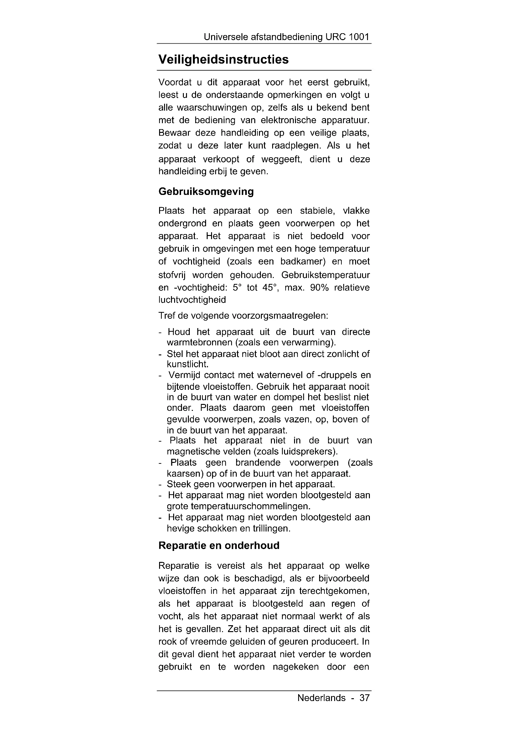 - Apparaatcodes Universele afstandbediening URC 1001 Nederlands - 37 Veiligheidsinstructies Voordat u dit apparaat voor het eerst gebruikt, leest u de onderstaande opmerkingen en volgt u alle waarschuwingen op, zelfs als u bekend bent met de bediening van elektronische apparatuur. Bewaar deze handleiding op een veilige plaats, zodat u deze later kunt raadplegen. Als u het apparaat verkoopt of weggeeft, dient u deze handleiding erbij te geven. Gebruiksomgeving Plaats het apparaat op een stabiele, vlakke ondergrond en plaats geen voorwerpen op het apparaat. Het apparaat is niet bedoeld voor gebruik in omgevingen met een hoge temperatuur of vochtigheid (zoals een badkamer) en moet stofvrij worden gehouden. Gebruikstemperatuur en -vochtigheid: 5° tot 45°, max. 90% relatieve luchtvochtigheid Tref de volgende voorzorgsmaatregelen: - Houd het apparaat uit de buurt van directe warmtebronnen (zoals een verwarming). - Stel het apparaat niet bloot aan direct zonlicht of kunstlicht. - Vermijd contact met waternevel of -druppels en bijtende vloeistoffen. Gebruik het apparaat nooit in de buurt van water en dompel het beslist niet onder. Plaats daarom geen met vloeistoffen gevulde voorwerpen, zoals vazen, op, boven of in de buurt van het apparaat. - Plaats het apparaat niet in de buurt van magnetische velden (zoals luidsprekers). - Plaats geen brandende voorwerpen (zoals kaarsen) op of in de buurt van het apparaat. - Steek geen voorwerpen in het apparaat. - Het apparaat mag niet worden blootgesteld aan grote temperatuurschommelingen. - Het apparaat mag niet worden blootgesteld aan hevige schokken en trillingen. Reparatie en onderhoud Reparatie is vereist als het apparaat op welke wijze dan ook is beschadigd, als er bijvoorbeeld vloeistoffen in het apparaat zijn terechtgekomen, als het apparaat is blootgesteld aan regen of vocht, als het apparaat niet normaal werkt of als het is gevallen. Zet het apparaat direct uit als dit rook of vreemde geluiden of geuren produceert. In dit geval dient het apparaat niet verder te worden gebruikt en te worden nagekeken door eenUniversele afstandbediening URC 1001 p. 103
