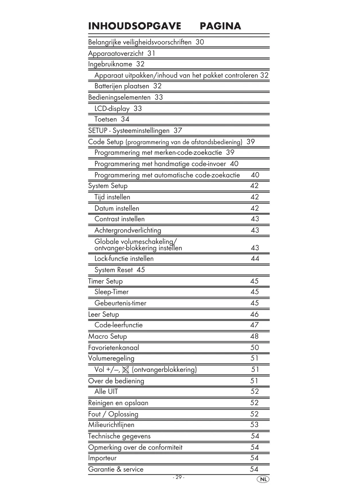 - Favorieten vastleggen Op de volgende pagina's ziet u een overzicht van de menu- structuur. BDA_KH 2159 - DT-53628_nl.indd 37 30.06.2010 14:40:02- 38 - BDA_KH 2159 - DT-53628_nl.indd 38 30.06.2010 14:40:02- 39 - Code Setup (programmering van de afstandsbediening) Er staan 3 programmeermethodes ter beschikking voor de afstandsbediening: programmering met merken-code-zoekac- tie, via automatische code-zoekactie en directe code-invoer (handmatig). Eerst moet u de merken-code-zoekactie gebruiken, aange- zien dit de snelste methode van programmering is als de fabrikant van uw apparaat is vermeld in de code-lijst. Als tweede heeft de directe code-invoer de voorkeur, gevolgd door de automatische code-zoekactie. Programmering met merken-code-zoekactie Bij deze methode kiest u direct voor merk en code via het LCD-display q. Volg de onderstaande bedieningsaanwijzingen op, om de afstandsbediening te programmeren: