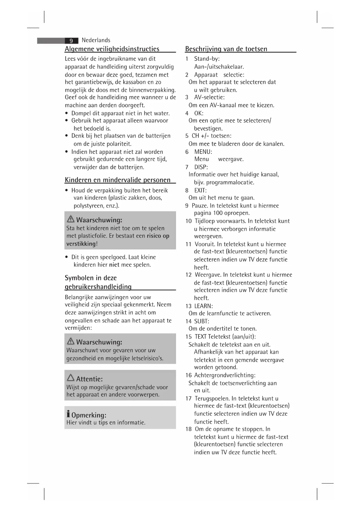 9 Pauze. In teletekst kunt u hiermee pagina 100 oproepen.