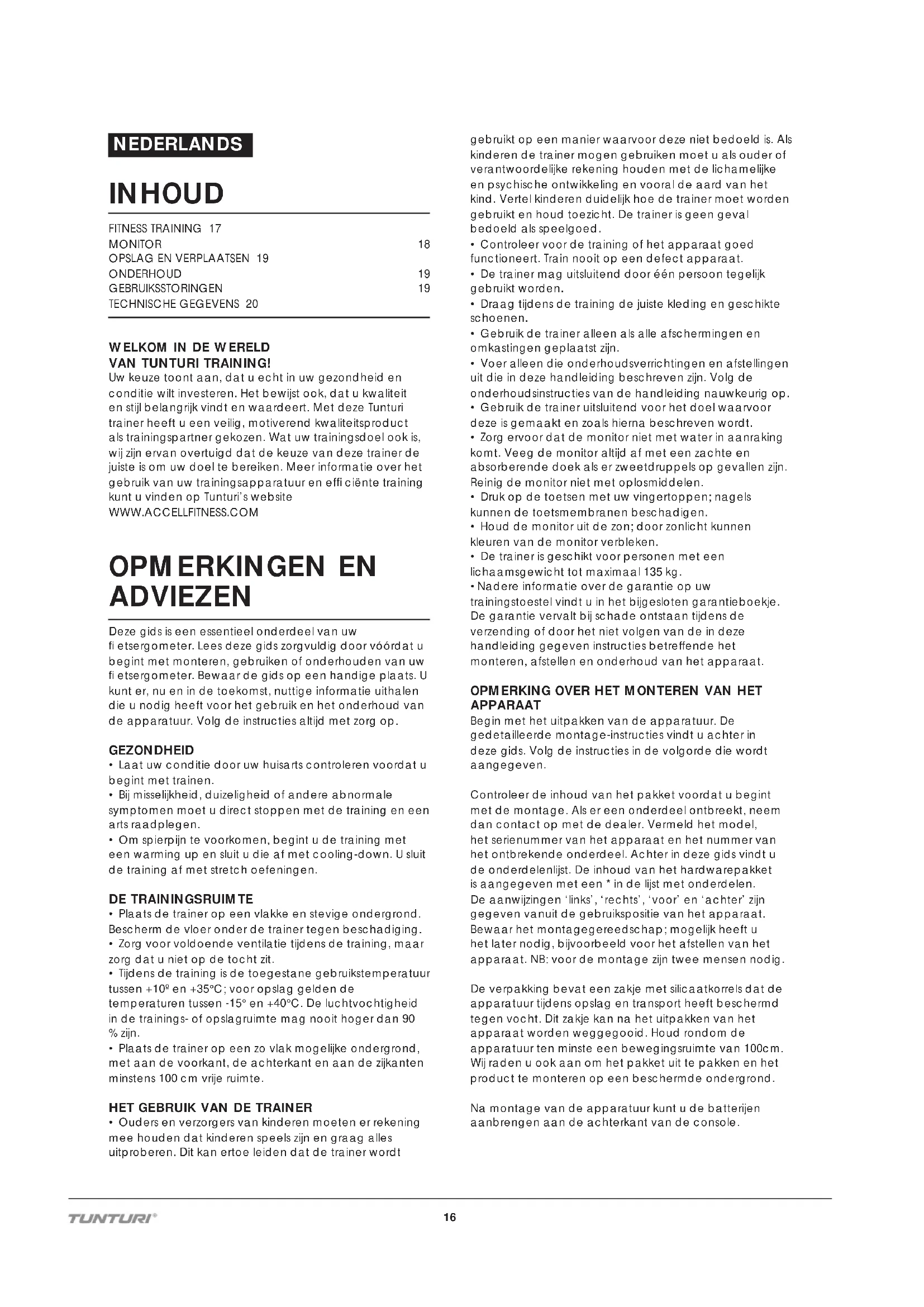 VAN TUNTURI TRAINING! Uw keuze toont aan, dat u echt in uw gezondheid en conditie wilt investeren. Het bewijst ook, dat u kwaliteit en stijl belangrijk vindt en waardeert. Met deze Tunturi trainer heeft u een veilig, motiverend kwaliteitsproduct als trainingspartner gekozen. Wat uw trainingsdoel ook is, wij zijn ervan overtuigd dat de keuze van deze trainer de juiste is om uw doel te bereiken. Meer informatie over het gebruik van uw trainingsapparatuur en effi ciënte training kunt u vinden op Tunturi’s website