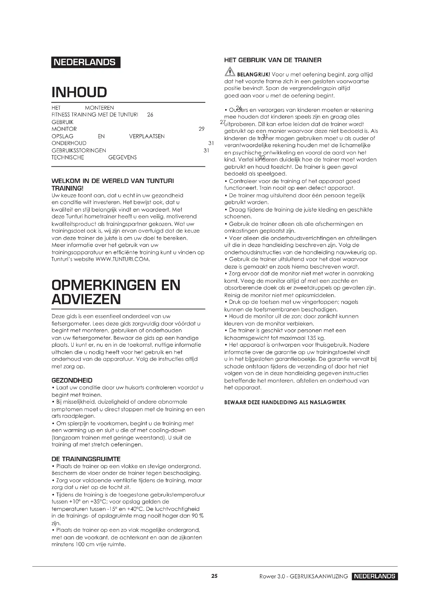 TRAINING! Uw keuze toont aan, dat u echt in uw gezondheid en conditie wilt investeren. Het bewijst ook, dat u kwaliteit en stijl belangrijk vindt en waardeert. Met deze Tunturi hometrainer heeft u een veilig, motiverend kwaliteitsproduct als trainingspartner gekozen. Wat uw trainingsdoel ook is, wij zijn ervan overtuigd dat de keuze van deze trainer de juiste is om uw doel te bereiken. Meer informatie over het gebruik van uw trainingsapparatuur en efciënte training kunt u vinden op Tunturi’s website WWW.TUNTURI.COM. OPMERKINGEN EN ADVIEZEN Deze gids is een essentieel onderdeel van uw etsergometer. Lees deze gids zorgvuldig door vóórdat u begint met monteren, gebruiken of onderhouden van uw etsergometer. Bewaar de gids op een handige plaats. U kunt er, nu en in de toekomst, nuttige informatie uithalen die u nodig heeft voor het gebruik en het onderhoud van de apparatuur. Volg de instructies altijd met zorg op. GEZONDHEID