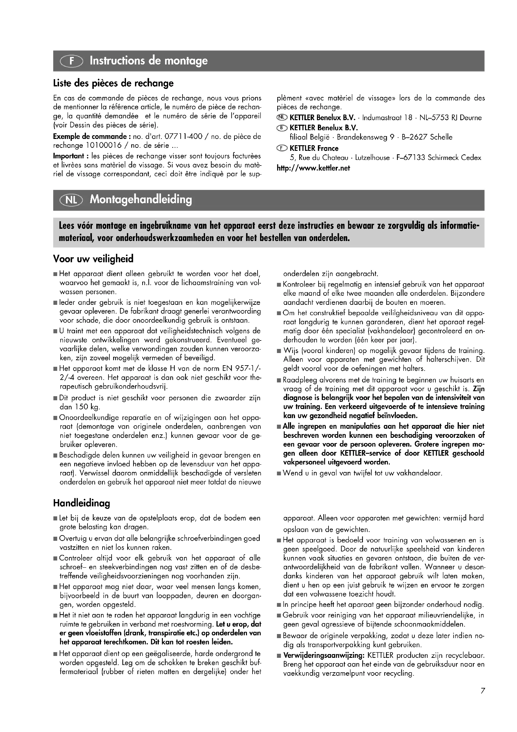 Lees vóór montage en ingebruikname van het apparaat eerst deze instructies en bewaar ze zorgvuldig als informatie- materiaal, voor onderhoudswerkzaamheden en voor het bestellen van onderdelen. onderdelen zijn aangebracht. ■ Kontroleer bij regelmatig en intensief gebruik van het apparaat elke maand of elke twee maanden alle onderdelen. Bijzondere aandacht verdienen daarbij de bouten en moeren. ■ Om het construktief bepaalde veililgheidsniveau van dit appa- raat langdurig te kunnen garanderen, dient het aparaat regel- matig door één specialist (vakhandelaar) gecontroleerd en on- derhouden te worden (één keer per jaar). ■ Wijs (vooral kinderen) op mogelijk gevaar tijdens de training. Alleen voor apparaten met gewichten of halterschijven. Dit geldt vooral voor de oefeningen met halters. ■ Raadpleeg alvorens met de training te beginnen uw huisarts en vraag of de training met dit apparaat voor u geschikt is. Zijn diagnose is belangrijk voor het bepalen van de intensiviteit van uw training. Een verkeerd uitgevoerde of te intensieve training kan uw gezondheid negatief beïnvloeden. ■ Alle ingrepen en manipulaties aan het apparaat die hier niet beschreven worden kunnen een beschadiging veroorzaken of een gevaar voor de persoon opleveren. Grotere ingrepen mo- gen alleen door KETTLER–service of door KETTLER geschoold vakpersoneel uitgevoerd worden. ■ Wend u in geval van twijfel tot uw vakhandelaar. Instructions de montage