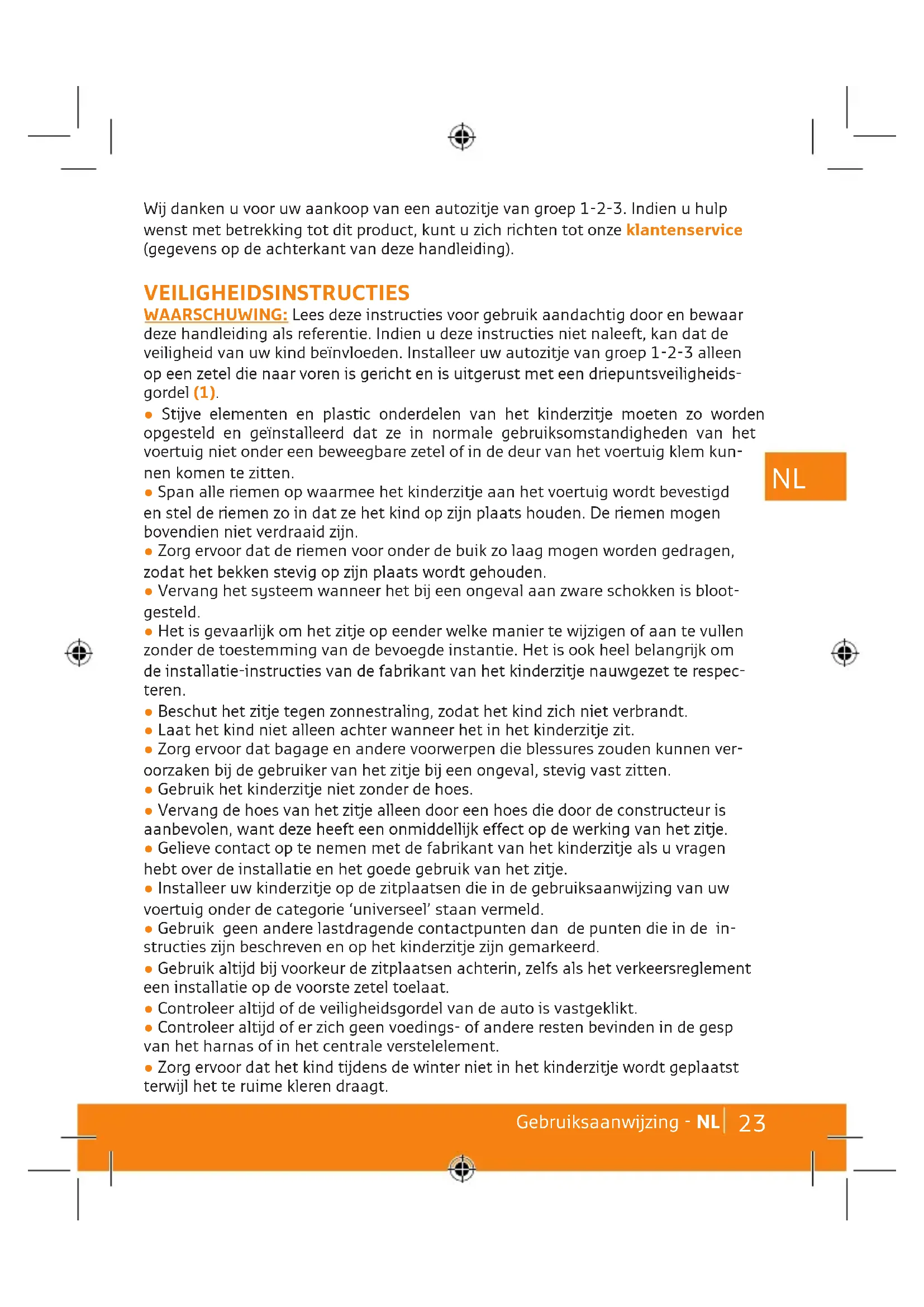 Wij danken u voor uw aankoop van een autozitje van groep 1-2-3. Indien u hulp wenst met betrekking tot dit product, kunt u zich richten tot onze klantenservice (gegevens op de achterkant van deze handleiding). VEILIGHEIDSINSTRUCTIES WAARSCHUWING: Lees deze instructies voor gebruik aandachtig door en bewaar deze handleiding als referentie. Indien u deze instructies niet naleeft, kan dat de veiligheid van uw kind beïnvloeden. Installeer uw autozitje van groep 1-2-3 alleen op een zetel die naar voren is gericht en is uitgerust met een driepuntsveiligheids- gordel (1).