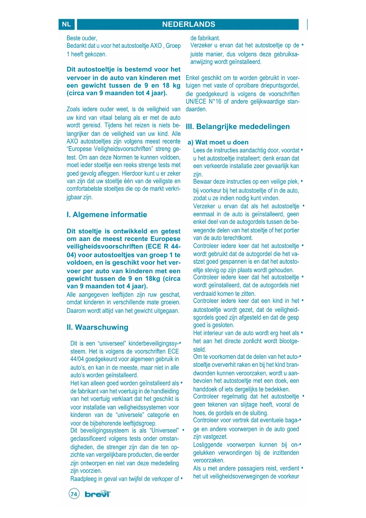 Beste ouder, Bedankt dat u voor het autostoeltje AXO , Groep 1 heeft gekozen. Dit autostoeltje is bestemd voor het vervoer in de auto van kinderen met een gewicht tussen de 9 en 18 kg (circa van 9 maanden tot 4 jaar). Zoals iedere ouder weet, is de veiligheid van uw kind van vitaal belang als er met de auto wordt gereisd. Tijdens het reizen is niets be- langrijker dan de veiligheid van uw kind. Alle AXO autostoeltjes zijn volgens meest recente “Europese Veiligheidsvoorschriften” streng ge- test. Om aan deze Normen te kunnen voldoen, moet ieder stoeltje een reeks strenge tests met goed gevolg afleggen. Hierdoor kunt u er zeker van zijn dat uw stoeltje één van de veiligste en comfortabelste stoeltjes die op de markt verkri- jgbaar zijn.