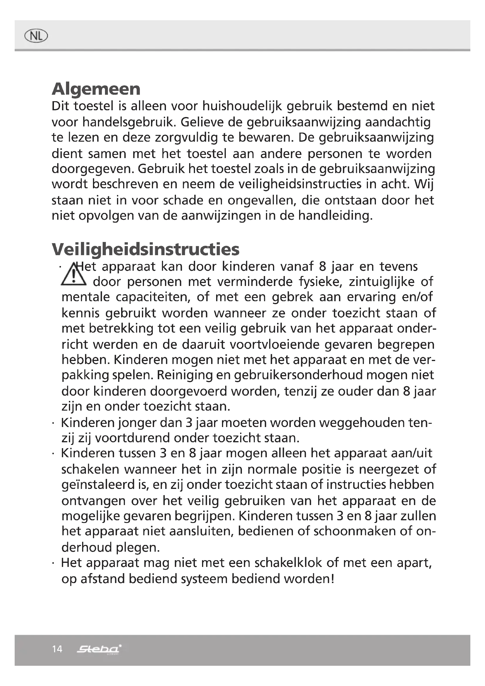 Het apparaat kan door kinderen vanaf 8aar en tevens door Personen met verminderde fysieke, zintuiglijke of mentale capaciteiten, of met een gebrek aan ervaring en/of kennis gebruikt worden wanner ze onder toezicht staan of met betrekking tot een veilig gebruik van het apparaat onderricht werden en de waaruit voortvloeijeende bevaren begrepen hebben. Kinderen mogen Niet met het apparaat en met de verpakking spelen. Reiniging en gebruikersonderhoud mogen nicht door kinderen doorgevoerd worden, tenzij ze ouder dan 8aar+zijn en onder toezicht staan.