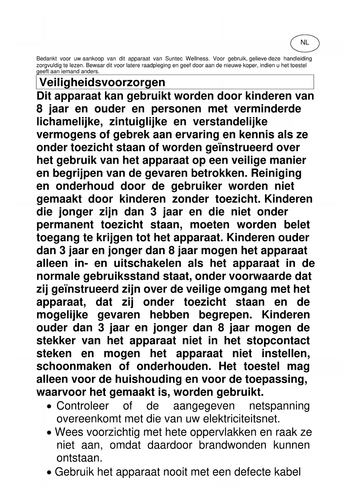 Heat Safe humid SUNTEC WELLNESS GMBH / HOLZSTRASSE 2 / 40221 DÜSSELDORF / GERMANYBedankt voor uw aankoop van dit apparaat van Suntec Wellness. Voor gebruik, gelieve deze handleiding zorgvuldig te lezen. Bewaar dit voor latere raadpleging en geef door aan de nieuwe koper, indien u het toestel geeft aan iemand anders. Veiligheidsvoorzorgen Dit apparaat kan gebruikt worden door kinderen van 8 jaar en ouder en personen met verminderde lichamelijke, zintuiglijke en verstandelijke vermogens of gebrek aan ervaring en kennis als ze onder toezicht staan of worden geïnstrueerd over het gebruik van het apparaat op een veilige manier en begrijpen van de gevaren betrokken. Reiniging en onderhoud door de gebruiker worden niet gemaakt door kinderen zonder toezicht. Kinderen die jonger zijn dan 3 jaar en die niet onder permanent toezicht staan, moeten worden belet toegang te krijgen tot het apparaat. Kinderen ouder dan 3 jaar en jonger dan 8 jaar mogen het apparaat alleen in- en uitschakelen als het apparaat in de normale gebruiksstand staat, onder voorwaarde dat zij geïnstrueerd zijn over de veilige omgang met het apparaat, dat zij onder toezicht staan en de mogelijke gevaren hebben begrepen. Kinderen ouder dan 3 jaar en jonger dan 8 jaar mogen de stekker van het apparaat niet in het stopcontact steken en mogen het apparaat niet instellen, schoonmaken of onderhouden. Het toestel mag alleen voor de huishouding en voor de toepassing, waarvoor het gemaakt is, worden gebruikt.