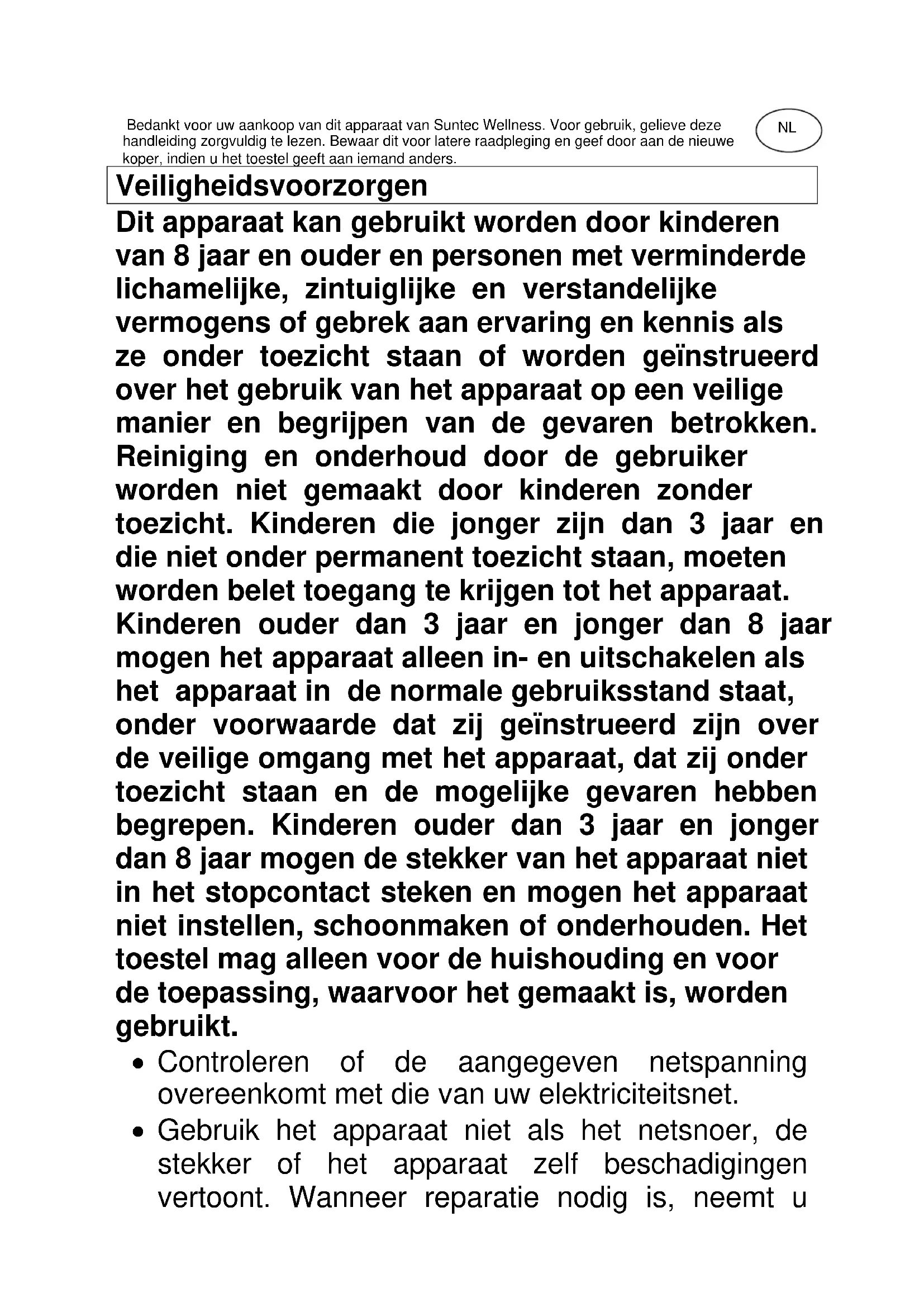 Heat Safe SUNTEC WELLNESS GMBH / HOLZSTRASSE 2 / 40221 DÜSSELDORF / GERMANY En cas de réclamationNL Bedankt voor uw aankoop van dit apparaat van Suntec Wellness. Voor gebruik, gelieve deze handleiding zorgvuldig te lezen. Bewaar dit voor latere raadpleging en geef door aan de nieuwe koper, indien u het toestel geeft aan iemand anders. Veiligheidsvoorzorgen Dit apparaat kan gebruikt worden door kinderen van 8 jaar en ouder en personen met verminderde lichamelijke, zintuiglijke en verstandelijke vermogens of gebrek aan ervaring en kennis als ze onder toezicht staan of worden geïnstrueerd over het gebruik van het apparaat op een veilige manier en begrijpen van de gevaren betrokken. Reiniging en onderhoud door de gebruiker worden niet gemaakt door kinderen zonder toezicht. Kinderen die jonger zijn dan 3 jaar en die niet onder permanent toezicht staan, moeten worden belet toegang te krijgen tot het apparaat. Kinderen ouder dan 3 jaar en jonger dan 8 jaar mogen het apparaat alleen in- en uitschakelen als het apparaat in de normale gebruiksstand staat, onder voorwaarde dat zij geïnstrueerd zijn over de veilige omgang met het apparaat, dat zij onder toezicht staan en de mogelijke gevaren hebben begrepen. Kinderen ouder dan 3 jaar en jonger dan 8 jaar mogen de stekker van het apparaat niet in het stopcontact steken en mogen het apparaat niet instellen, schoonmaken of onderhouden. Het toestel mag alleen voor de huishouding en voor de toepassing, waarvoor het gemaakt is, worden gebruikt.