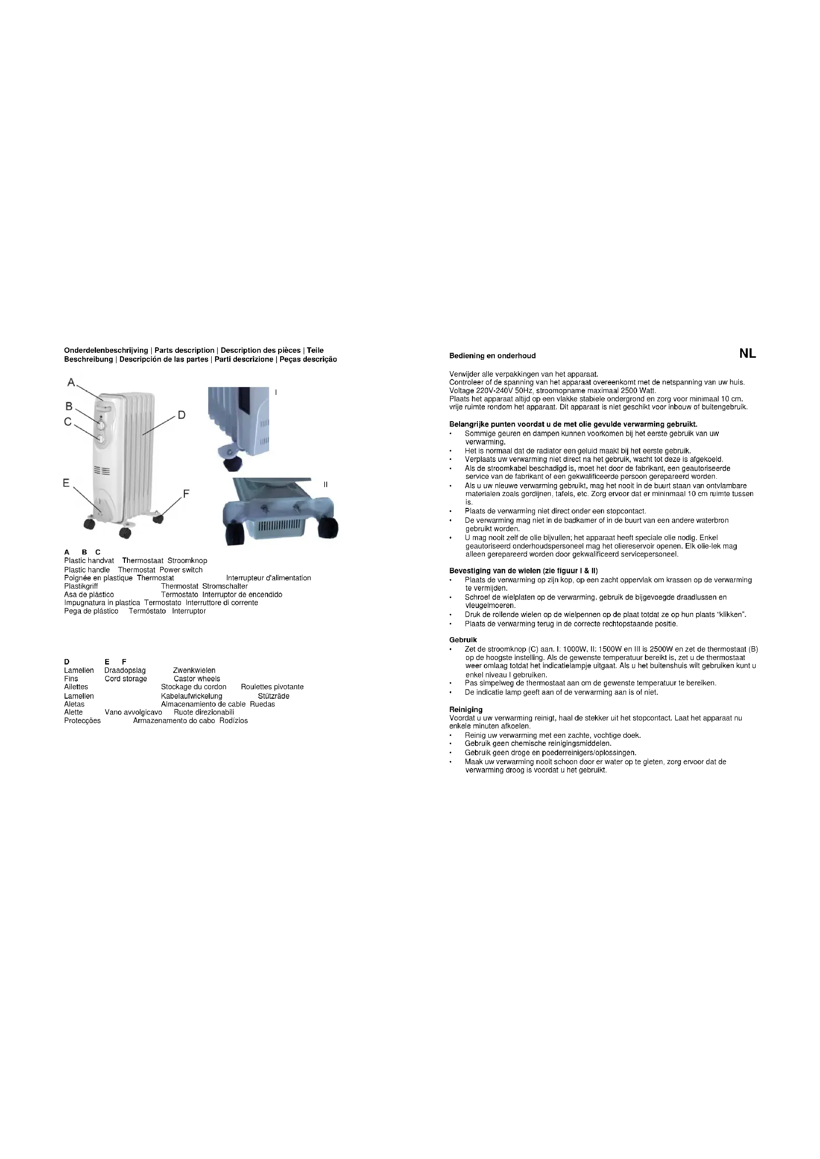 Verwijder alle verpakkingen van het apparaat. Controleer of de spanning van het apparaat overeenkomt met de netspanning van uw huis. Voltage 220V-240V 50Hz, stroomopname maximaal 2500 Watt. Plaats het apparaat altijd op een vlakke stabiele ondergrond en zorg voor minimaal 10 cm. vrije ruimte rondom het apparaat. Dit apparaat is niet geschikt voor inbouw of buitengebruik. Belangrijke punten voordat u de met olie gevulde verwarming gebruikt.