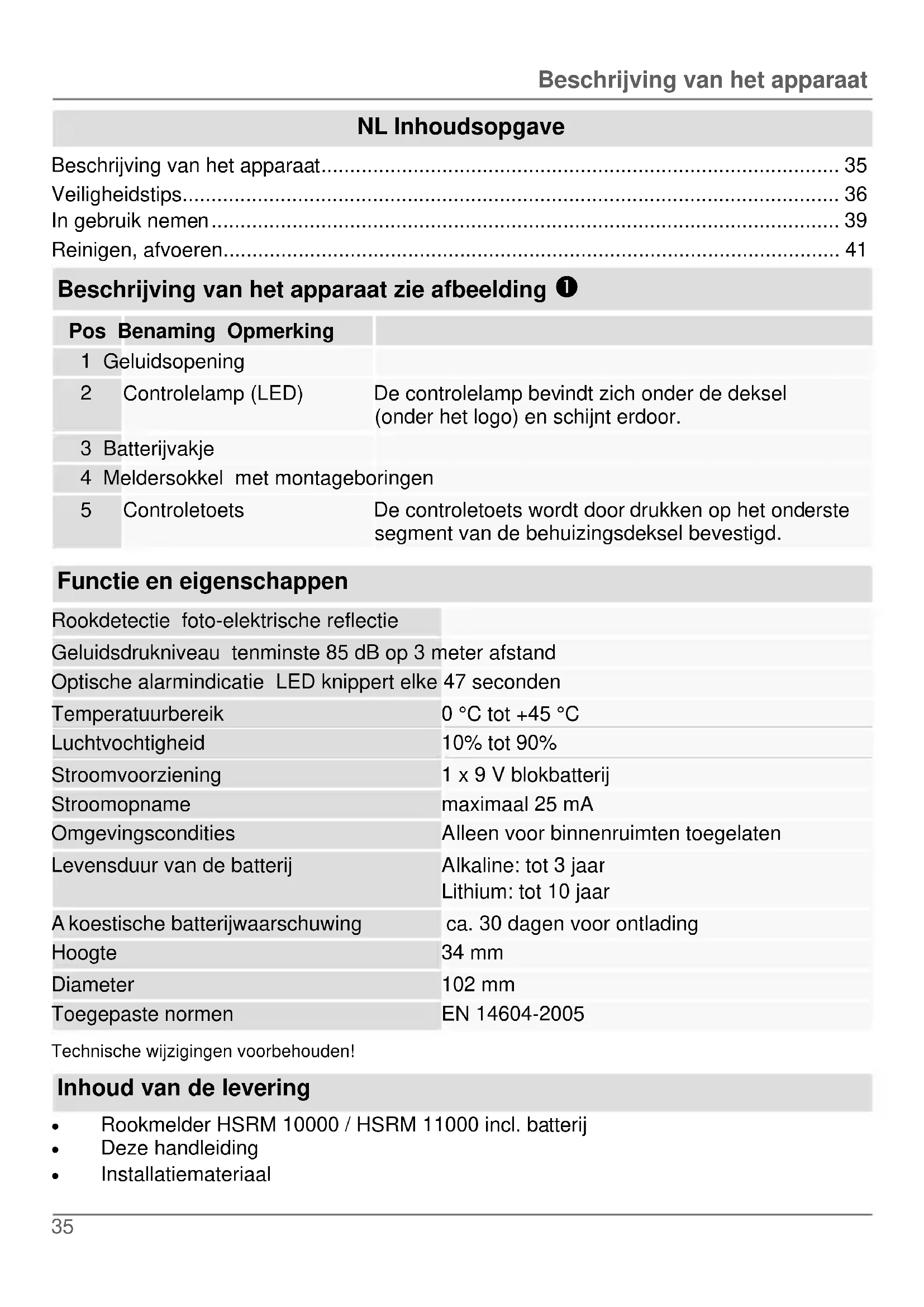 koestische batterijwaarschuwing ca. 30 dagen voor ontlading Hoogte 34 mm Diameter 102 mm Toegepaste normen EN 14604-2005 Technische wijzigingen voorbehouden! Inhoud van de levering Rookmelder HSRM 10000 / HSRM 11000 incl. batterij Deze handleiding InstallatiemateriaalVeiligheidstips