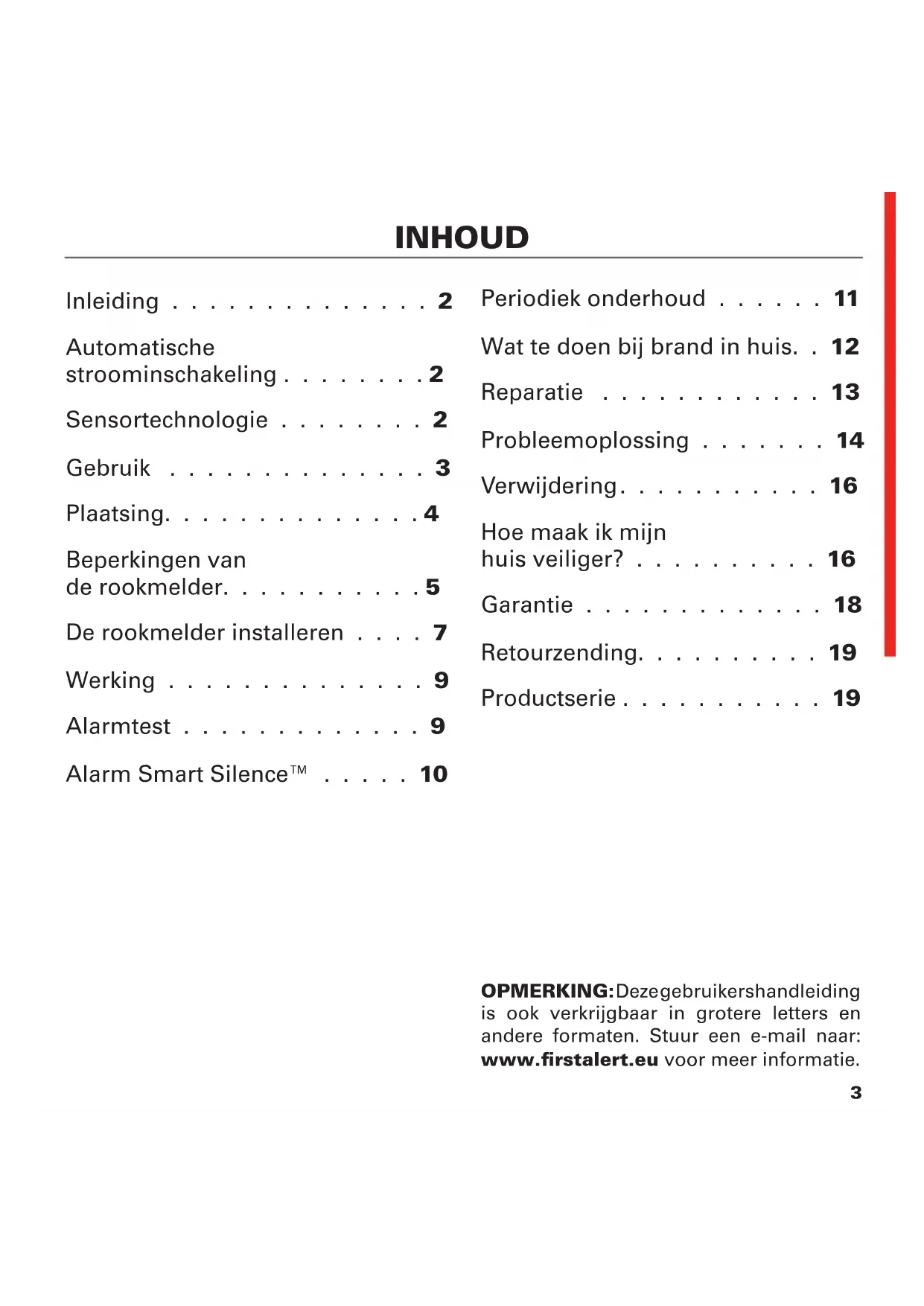 - INHOUD OPMERKING: Deze gebruikershandleiding is ook verkrijgbaar in grotere letters en andere formaten. Stuur een e-mail naar: www.firstalert.eu voor meer informatie. Inleiding p. 2