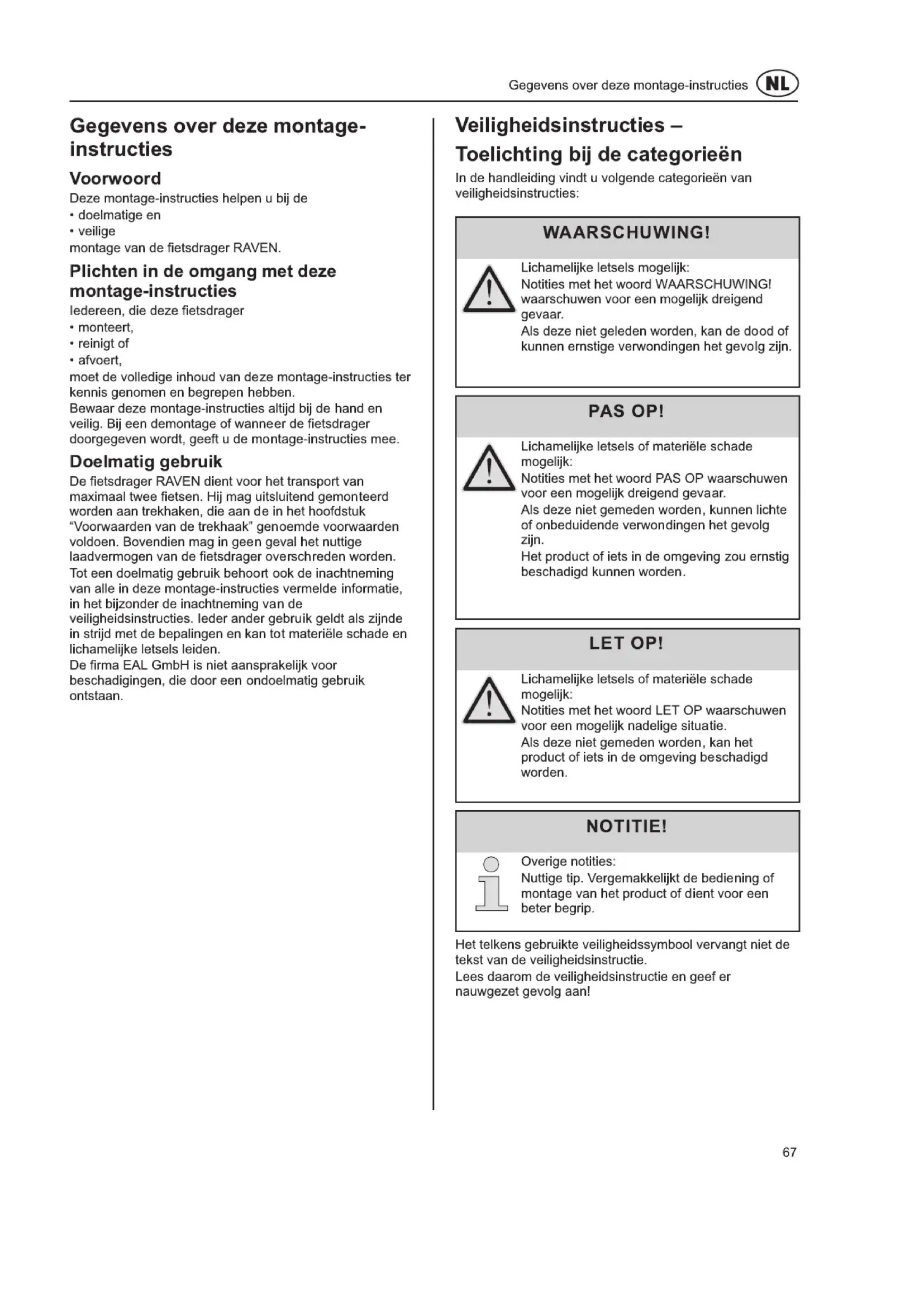 - afvoert, moet de volledige inhoud van deze montage-instructies ter kennis genomen en begrepen hebben. Bewaar deze montage-instructies altijd bij de hand en veilig. Bij een demontage of wanneer de fietsdrager doorgegeven wordt, geeft u de montage-instructies mee. Doelmatig gebruik De fietsdrager RAVEN dient voor het transport van maximaal twee fietsen. Hij mag uitsluitend gemonteerd worden aan trekhaken, die aan de in het hoofdstuk “Voorwaarden van de trekhaak” genoemde voorwaarden voldoen. Bovendien mag in geen geval het nuttige laadvermogen van de fietsdrager overschreden worden. Tot een doelmatig gebruik behoort ook de inachtneming van alle in deze montage-instructies vermelde informatie, in het bijzonder de inachtneming van de veiligheidsinstructies. Ieder ander gebruik geldt als zijnde in strijd met de bepalingen en kan tot materiële schade en lichamelijke letsels leiden. De firma EAL GmbH is niet aansprakelijk voor beschadigingen, die door een ondoelmatig gebruik ontstaan.68 WAARSCHUWING! Lichamelijke letsels of materiële schade door het verliezen van de fietsen. Het rijden zonder veiligheidsgordels kan tot ongevallen leiden.