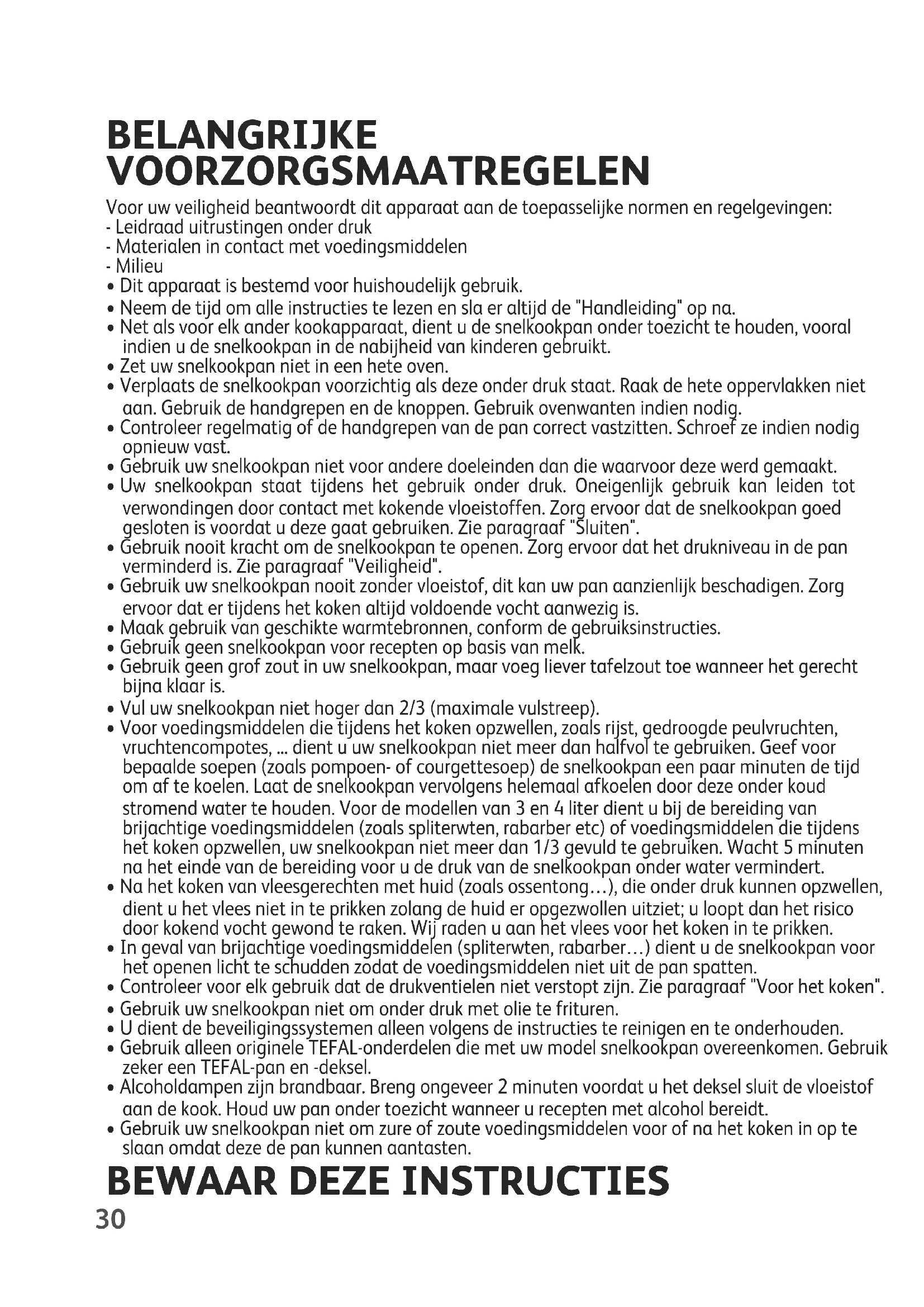 - Accurate timing is essential when pressure cooking to prevent overcooking, especially with vegetables, fruit and fish. EN30 BELANGRIJKE VOORZORGSMAATREGELEN Voor uw veiligheid beantwoordt dit apparaat aan de toepasselijke normen en regelgevingen: - Leidraad uitrustingen onder druk - Materialen in contact met voedingsmiddelen - Milieu