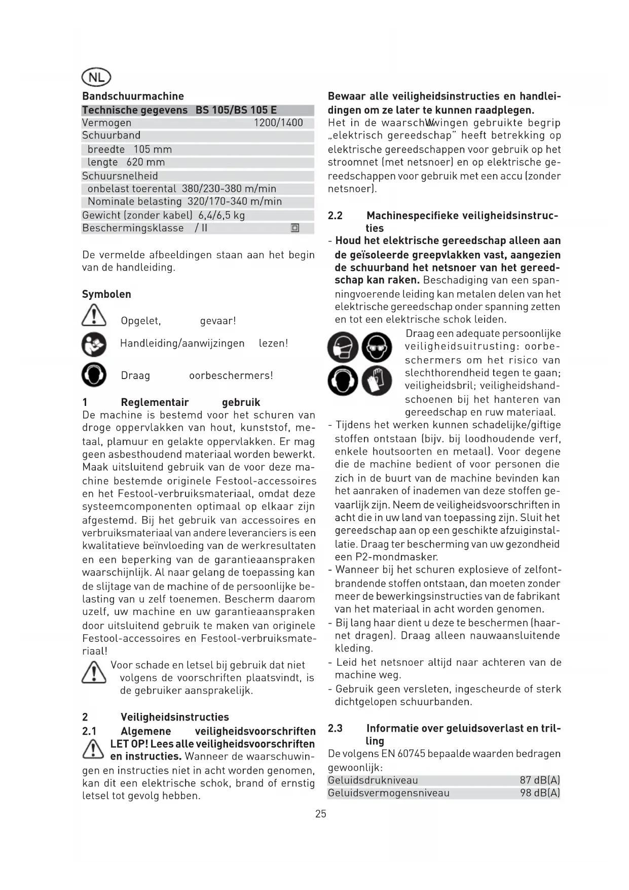 Utilizzare solo ricambi originali Festool! Cod. prodotto reperibile al sito: www.fe- stool.com/Service Mantenere sempre pulita l‘apparecchiatura e le fessure di ventilazione. L’apparecchio è munito di spazzole autoestinguenti. Quando questi risultano consumati, viene interrotta automaticamente la corrente e l’apparecchio si arresta. Quando la guarnizione in grafi te è consumata, è necessario sostituire la base di levigatura (3.4). A tale sco- po, aprire le tre viti (3.2) e rimuovere il listello di spinta (3.3). 7 Accessori, utensili I codici di ordinazione degli accessori descritti di seguito si trovano sul catalogo Festool o su Internet al sito “www.festool.com”. Base di levigatura Per i lavori di smerigliatura grezzi con elevata asportazione di materiale è disponibile una base di levigatura. Nastri abrasivi - Nastri abrasivi con tessuto a X legato con resina sintetica: levigatura di legno, pannelli in fi bra dura, ferro, lamiera d‘acciaio, metallo non fer- roso e metallo leggero. - Nastri abrasivi combinati: rimozione di mani di vernice e residui di calcestruzzo, levigatura di superfi ci di gesso. 8 Smaltimento Non gettare gli elettroutensili nei rifi uti domestici! Provvedere ad uno smaltimento ecologico dell’e- lettroutensile, degli accessori e dell’imballaggio! Osservare le indicazioni nazionali in vigore. Solo UE: la Direttiva europea 2002/96/CE preve- de che gli elettroutensili usati vengano raccolti separatamente e smaltiti in conformità con le disposizioni ambientali. Informazioni su REACh: www.festool.com/reach25 Bandschuurmachine Technische gegevens BS 105/BS 105 E Vermogen 1200/1400 W Schuurband breedte 105 mm lengte 620 mm Schuursnelheid onbelast toerental 380/230-380 m/min Nominale belasting 320/170-340 m/min Gewicht (zonder kabel) 6,4/6,5 kg Beschermingsklasse / II De vermelde afbeeldingen staan aan het begin van de handleiding. Symbolen Opgelet, gevaar! Handleiding/aanwijzingen lezen! Draag oorbeschermers! 1 Reglementair gebruik De machine is bestemd voor het schuren van droge oppervlakken van hout, kunststof, me- taal, plamuur en gelakte oppervlakken. Er mag geen asbesthoudend materiaal worden bewerkt. Maak uitsluitend gebruik van de voor deze ma- chine bestemde originele Festool-accessoires en het Festool-verbruiksmateriaal, omdat deze systeemcomponenten optimaal op elkaar zijn afgestemd. Bij het gebruik van accessoires en verbruiksmateriaal van andere leveranciers is een kwalitatieve beïnvloeding van de werkresultaten en een beperking van de garantieaanspraken waarschijnlijk. Al naar gelang de toepassing kan de slijtage van de machine of de persoonlijke be- lasting van u zelf toenemen. Bescherm daarom uzelf, uw machine en uw garantieaanspraken door uitsluitend gebruik te maken van originele Festool-accessoires en Festool-verbruiksmate- riaal! Voor schade en letsel bij gebruik dat niet volgens de voorschriften plaatsvindt, is de gebruiker aansprakelijk. 2 Veiligheidsinstructies