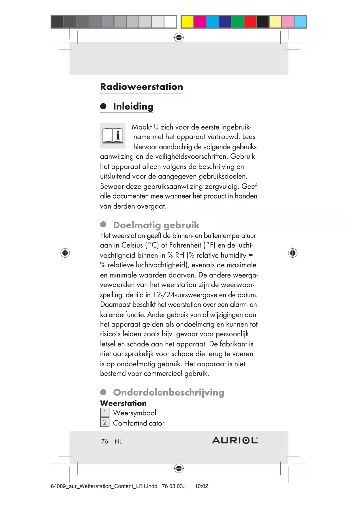 Technische gegevens Weerstation: Temperatuurmeetbereik (binnentemperatuur): 0 - + 50 °C + 32 - + 140 °F 64089_aur_Wetterstation_Content_LB1.indd 77 03.03.11 10:0278 NL Temperatuurresolutie: 0,1 °C Meetbereik luchtvochtigheid: 30 - 95 % Resolutie luchtvochtigheid: 1 % Radiografisch signaal: DCF Batterij: 2 x AA 1,5 V (bij de levering inbegrepen) Buitensensor: Temperatuurmeetbereik: -20 - + 60 °C -4 - + 140 °F HF overdrachtssignaal: 433 MHz HF overdrachtsreikwijdte: max. 30 meter op open terrein Batterij: 2 x AA 1,5 V (bij de levering inbegrepen)