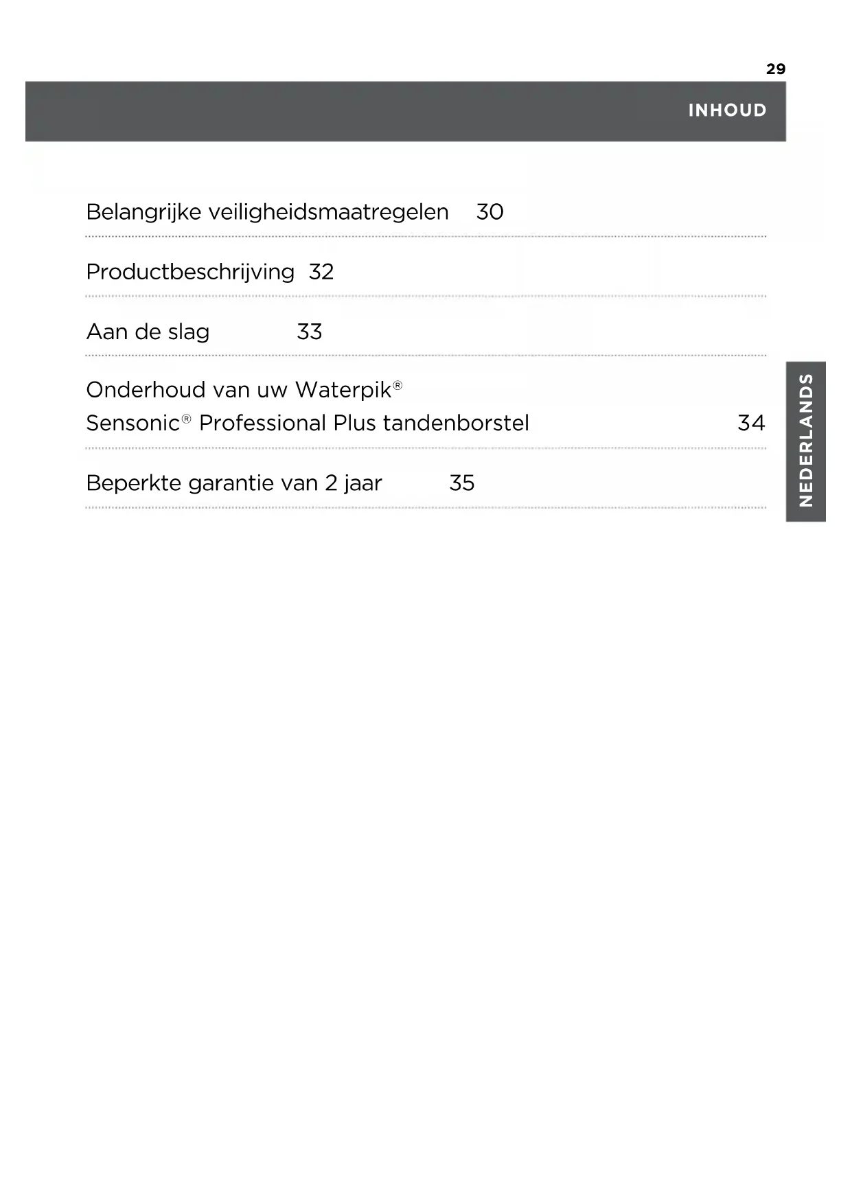 Water Pik, Inc. garandeert aan de oorspronkelijke koper/eigenaar van dit product dat het vrij is van defecten in materialen en werkmanschap gedurende twee jaar vanaf de verkoopdatum. Houd uw ontvangstbewijs bij als bewijs van de aankoopdatum. Water Pik, Inc. behoudt zich hetrecht voor te verzoeken dat het product aan ons worden geretourneerd voor analyse om te bevestigen dat de klacht door ons garantiebeleid worden gedekt. We zullen om het even welk onderdeel van dit product dat volgens ons defect is, verrangen op voorwaarde dat het product Niet verkeerd gebruikt, misbruikt, gewijzigd of beschadigd is na aankoop en gebruikt werden volgens deze instructies. Reparatie- of verwangingservices die door de garantie worden voorzien zullen uitgevoerd worden door deplaatselijk distributeur; u kunt de details vinden op [www.waterpik.com/intl.]. Op verzoek van de klant zal een kopie van de garantie met de informatatie van deplaatselijk distributeur aan uverschaft worden via e-mail of per post. Deze beperkte garantie geldt nicht voor accessoires of verbruiksartikelen zoals opzetborstels, etc. Deze garantie geeft u specifieke wettelijk rechten. Het kan ook� dat u andere rechten hebt die variieren naargelang de wetten van uw woonplaats.