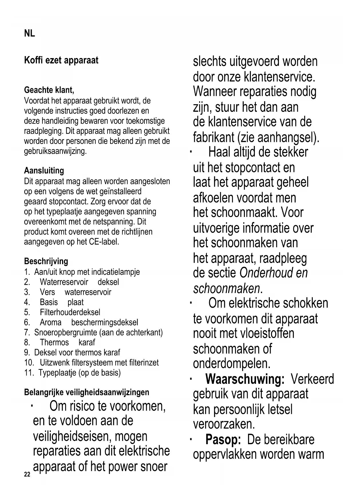Belangrijke veiligheidsaanwijzingen ∙ Om risico te voorkomen, en te voldoen aan de veiligheidseisen, mogen reparaties aan dit elektrische apparaat of het power snoer slechts uitgevoerd worden door onze klantenservice. Wanneer reparaties nodig zijn, stuur het dan aan de klantenservice van de fabrikant (zie aanhangsel). ∙ Haal altijd de stekker uit het stopcontact en laat het apparaat geheel afkoelen voordat men het schoonmaakt. Voor uitvoerige informatie over het schoonmaken van het apparaat, raadpleeg de sectie Onderhoud en schoonmaken. ∙ Om elektrische schokken te voorkomen dit apparaat nooit met vloeistoffen schoonmaken of onderdompelen. ∙ Waarschuwing: Verkeerd gebruik van dit apparaat kan persoonlijk letsel veroorzaken. ∙ Pas op: De bereikbare oppervlakken worden warm NL23 tijdens gebruik en zullen daarna nog enige tijd warm blijven. ∙ Dit apparaat is bestemd voor huishoudelijk of gelijkwaardig gebruik, zoals - in bedrijfskeukens, in winkels, kantoren of andere bedrijfsruimtes, - in agrarische instellingen, - door klanten in hotels, motels enz. en gelijkwaardige accommodaties, - in bed and breakfast gasthuizen. ∙ Dit apparaat mag gebruikt worden door kinderen (tenminste 8 jaar oud) en door personen met verminderde fysische, zintuigelijke of mentale bekwaanheden, of gebrek van ervaring en kennis, wanneer deze onder begeleiding zijn of instructies ontvangen hebben over het gebruik van dit apparaat en volledig de gevaren en veiligheidsvoorschriften begrijpen. ∙ Kinderen mogen niet met het apparaat spelen. ∙ Kinderen mogen in geen geval dit apparaat schoonmaken of onderhoudswerkzaamheden uitvoeren behalve wanneer onder toezicht van een volwassene en ze tenminste 8 jaar oud zijn. ∙ Het apparaat en het snoer moeten altijd goed weggehouden worden van kinderen jonger dan 8 jaar. ∙ Waarschuwing: Houdt kinderen weg van inpakmateriaal, daar deze een bron van gevaar zijn b.v. door verstikking. ∙ Voordat het apparaat wordt gebruikt moet zowel de hoofdeenheid inclusief het powersnoer als gelijk welk hulpstuk, dat wordt aangebracht, eerst zorgvuldig op eventuele defecten worden gecontroleerd. Ingeval het apparaat, bijvoorbeeld, op een hard oppervlak is gevallen, of wanneer men met overdadige kracht aan het power snoer getrokken heeft, mag men het niet meer gebruiken: zelfs onzichtbare beschadiging kan24 ongewenste effecten hebben op de gebruiksveiligheid van het apparaat. ∙ Tijdens het gebruik moet men zorgen dat het koffi ezet apparaat op een vlakke en non-slip ondergrond geplaatst is die tegen spetteren en vlekken kan. ∙ Zorg ervoor dat het apparaat en het snoer niet in aanraking komen met een hete ondergrond of andere hittebronnen. ∙ Laat dit apparaat nooit onbeheerd achter. ∙ Om het gevaar van uitstoten van heet water of stoom te voorkomen, moet men het koffi ezetapparaat altijd uitschakelen en voldoende tijd geven om af te koelen voordat het opent of accessoires of hulpstukken verwijderd. ∙ Verwijder altijd de stekker uit het stopcontact: - wanneer het apparaat niet werkt, - na gebruik, - wanneer men het apparaat schoonmaakt. ∙ Trek de stekker niet aan het snoer uit het stopcontact, trek aan de stekker zelf. ∙ Laat het snoer nooit los hangen: het snoer moet vrijgehouden worden van hete onderdelen van het apparaat. ∙ Wordt dit apparaat op een verkeerde manier gebruikt of worden de veiligheidsregels niet gevolgd, dan kan de fabrikant niet aansprakelijk worden gesteld voor eventuele schades. ∙ Waarschuwing: Het waterreservoir word heet tijdens gebruik. Eerste ingebruikname ∙ Voordat men het apparaat voor het eerst gebruikt moet men eerst twee of drie keer het fi ltersysteem laten draaien met de maximale hoeveelheid water maar zonder het gebruik van koffi epoeder. Dit moet men ook doen wanneer men het apparaat voor een langere tijd gebruikt heeft, en na het ontkalken. Koffi e maken ∙ Open de uitzwenkfi lterhouder en neem er de fi lterhouder deksel vanaf. ∙ Plaats een maat-4 papieren fi lter in de fi lterinzet, vouw eerst de geperforeerde zijdes van de fi lter omlaag. ∙ Wij bevelen het gebruik van fi jn gemalen koffi e aan: ∙ voor normale-maat koppen gebruik ongeveer 6 gr (= 2 theelepels) van gemalen koffi e; ∙ voor kleine koppen gebruik ongeveer 4gr (= 1½ theelepels). ∙ Afhangend van jouw persoonlijke smaak, de eigenlijke gebruikte hoeveelheid kan verschillen. ∙ Plaats de fi lterhouderdeksel terug en sluit de uitzwenkfi lter. ∙ Open de deksel van de verswatercontainer en vul het met de gewenste hoeveelheid koud water, neem de minimum vul hoeveelheid (2 koppen) in acht. ∙ Twee maatschalen op de ventielunit helpen met het vinden van de juiste hoeveelheid vers water: ∙ linker schaal voor normale maat koppen (ongeveer 125 ml). ∙ rechter schaal voor kleine koppen. ∙ Waarschuwing: Wees voorzichtig om niet de maximale waterlevel van 8 medium-maat koppen te overschrijden daar anders kokend water uitgestoten kan worden. ∙ Sluit de waterreservoirdeksel. Dit is belangrijk daar het Vapotronic systeem alleen werkt wanneer de deksel gesloten is.25 ∙ Plaats de aroma-beschermingsdeksel op de karaf, en plaats de karaf op de basis plaat. ∙ Druk op de aan/uit knop; het indicatielampje zal aangaan en het opwarmproces zal beginnen. Met het waterreservoir gevuld tot maximum, zal het ongeveer 5 minuten duren om het water aan de kook te brengen. ∙ Zodra de optimale brouwtemperatuur bereikt is, zal het ventiel openen en de brouwcyclus zal beginnen. ∙ Het Vapotronic systeem zal het opwarmproces automatisch uitschakelen. ∙ De koffi e begint te vloeien door de fi lter in de thermos karaf. ∙ Het indicatielampje gaat uit zodra de fi ltratiecyclus voltooid is. ∙ De brouwcyclus kan onderbroken worden door nogmaals op de aan/uit knop te drukken. ∙ Verwijder de karaf van de basis plaat. ∙ Neem er de aromabeschermingsdeksel vanaf en vervang het met de schroef-in deksel voor de karaf. ∙ De vers gebrouwen koffi e kan geschonken worden zonder da