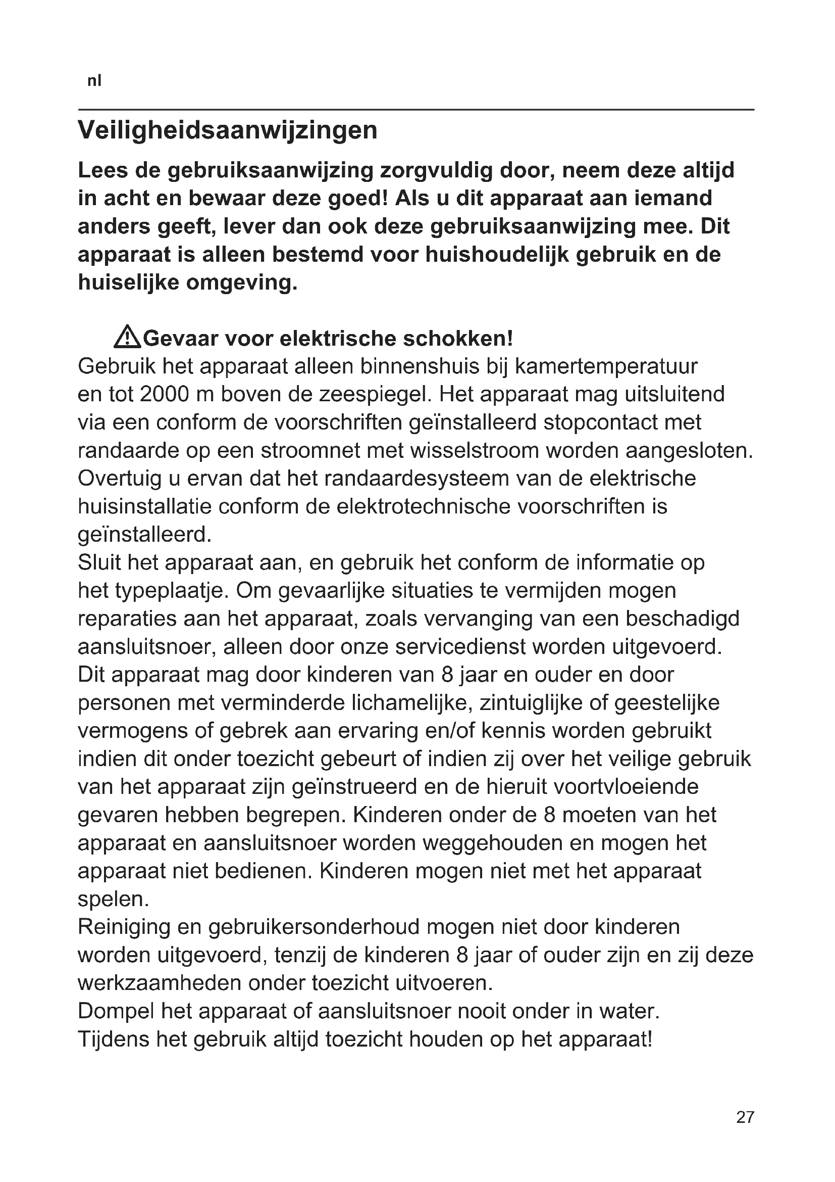 Veiligheidsaanwijzingen Lees de gebruiksaanwijzing zorgvuldig door, neem deze altijd in acht en bewaar deze goed! Als u dit apparaat aan iemand anders geeft, lever dan ook deze gebruiksaanwijzing mee. Dit apparaat is alleen bestemd voor huishoudelijk gebruik en de huiselijke omgeving. WGevaar voor elektrische schokken! Gebruik het apparaat alleen binnenshuis bij kamertemperatuur en tot 2000 m boven de zeespiegel. Het apparaat mag uitsluitend via een conform de voorschriften geïnstalleerd stopcontact met randaarde op een stroomnet met wisselstroom worden aangesloten. Overtuig u ervan dat het randaardesysteem van de elektrische huisinstallatie conform de elektrotechnische voorschriften is geïnstalleerd. Sluit het apparaat aan, en gebruik het conform de informatie op het typeplaatje. Om gevaarlijke situaties te vermijden mogen reparaties aan het apparaat, zoals vervanging van een beschadigd aansluitsnoer, alleen door onze servicedienst worden uitgevoerd. Dit apparaat mag door kinderen van 8 jaar en ouder en door personen met verminderde lichamelijke, zintuiglijke of geestelijke vermogens of gebrek aan ervaring en/of kennis worden gebruikt indien dit onder toezicht gebeurt of indien zij over het veilige gebruik van het apparaat zijn geïnstrueerd en de hieruit voortvloeiende gevaren hebben begrepen. Kinderen onder de 8 moeten van het apparaat en aansluitsnoer worden weggehouden en mogen het apparaat niet bedienen. Kinderen mogen niet met het apparaat spelen. Reiniging en gebruikersonderhoud mogen niet door kinderen worden uitgevoerd, tenzij de kinderen 8 jaar of ouder zijn en zij deze werkzaamheden onder toezicht uitvoeren. Dompel het apparaat of aansluitsnoer nooit onder in water. Tijdens het gebruik altijd toezicht houden op het apparaat!28