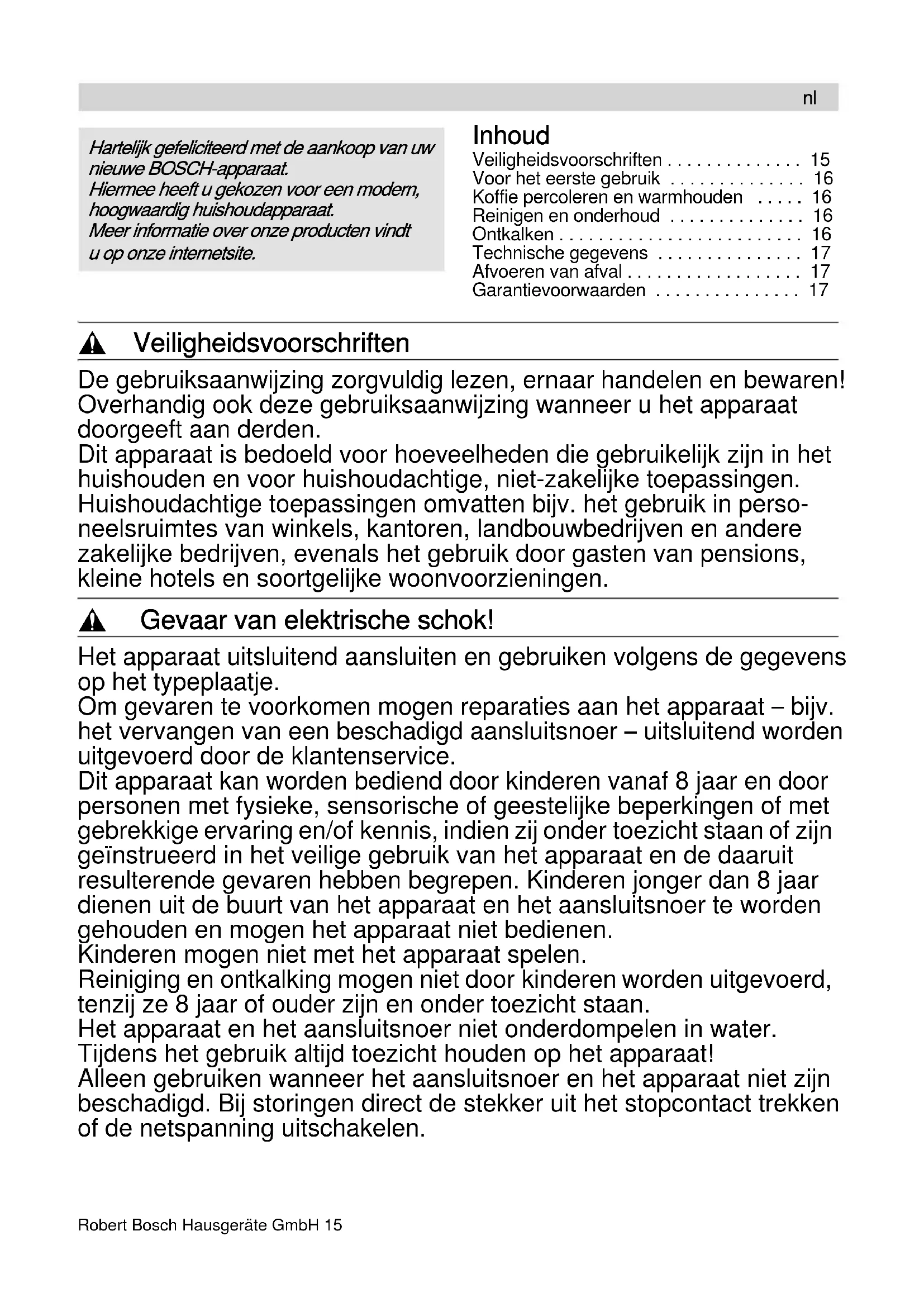 Hartelijk gefeliciteerd met de aankoop van uw nieuwe BOSCH-apparaat. Hiermee heeft u gekozen voor een modern, hoogwaardig huishoudapparaat. Meer informatie over onze producten vindt u op onze internetsite.16 Robert Bosch Hausgeräte GmbH , Verbrandings- en brandgevaar! Delen van het apparaat en glazen kan tijdens het gebruik alleen aan de daarvoor voorziene grepen vastpakken. Het apparaat niet neer- zetten op of in de buurt van hete oppervlakken, bijv. fornuisplaten. Neerzetoppervlak voor kan nooit afdekken. , Verstikkingsgevaar! Laat kinderen niet met het verpakkingsmateriaal spelen. Deze gebruiksaanwijzing beschrijft verschillende modellen: – Basismodel (afb. 6a) met alleen een aan-/uitschakelaar,– model (afb. 6b) heeft een extra schake-laar voor kopjesselectie,Alle modellen zijn geprogrammeerd met een automatische uitschakeling „auto off” (energiebesparing), die het apparaat na ca. 40 minuten uitschakelt. Voor het eerste gebruik Tweemaal 9 kopjes water laten doorlopen om het apparaat te reinigen. Mogelijk verspreidt het apparaat ongewenste geuren, die echter geen kwaad kunnen.Laat in dit geval een verdunde azijnoplossing doorlopen (2 kopjes azijn op 6 kopjes water) en daarna tweemaal 9 kopjes water. Koffie percoleren en warmhouden Afb. 1 t/m 5Uitsluitend schoon water in het water-reservoir doen en nooit melk, thee of koffie (verandering van de smaak bij de volgende maal koffiezetten)!Filterzakje 1x4 in de filterhouder doen.Middelfijn gemalen koffie gebruiken (ons advies is ca. 7 g per kopje), bij weinig kopjes iets meer koffie per kopje nemen dan bij een groter aantal kopjes.Minstens 3 grote kopjes zetten, anders heeft de koffie nog niet de gewenste temperatuur en sterkte.= ca. 125 ml = ca. 85 mlNa uitschakeling van het apparaat blijft het warmhoudplaatje nog enige tijd warm.Het koffiezetapparaat moet 5 minuten afkoelen voordat u er opnieuw water in mag doen.U kunt zo ook thee zetten. Schakelaar voor het aantal kopjes Door op 3–6 (3–6 kopjes) of op 7–10 (7–10 kopjes) te drukken, kunt u de sterkte en daarmee het aroma kiezen. Reinigen en onderhoud Gevaar van een elektrische schok Voor het reinigen de stekker uit het stop- contact trekken. Het apparaat niet in water dompelen en niet in de afwasautomaat doen. Geen stoomreiniger gebruiken. Alle onderdelen die met koffie in contact komen, dienen na elk gebruik gereinigd te worden. Achtergebleven resten hebben een negatieve invloed op de smaak.Alle losse onderdelen zijn geschikt voor reiniging in de afwasautomaat; niet boven de verwarming plaatsen of vastklemmen (ze kunnen vervormd raken).De buitenzijde van de behuizing uitsluitend reinigen met een vochtige doek. Geen schurende middelen gebruiken. Ontkalken Het apparaat regelmatig ontkalken; uiterlijk wanneer– de percolatietijd langer wordt,– er bovenmatig veel stoom ontstaat,– het apparaat meer lawaai maakt.Ontkalkingsmiddel doseren volgens de aan-wijzingen van de fabrikant en in het water-reservoir gieten.De oplossing 5 minuten laten staan, vervol-gens het apparaat inschakelen, na 1 minuut weer uitschakelen en 10 minuten laten staan. Dit minstens driemaal herhalen (bij sterke verkalking vaker). De resterende hoeveelheid laten doorlopen. nlRobert Bosch Hausgeräte GmbH 17 Tweemaal 9 kopjes schoon water laten doorlopen. Bij de varianten met keuze van het aantal kopjes dient u de schakelaar tijdens het ontkalken op 3–6 kopjes te zetten. Alle losse onderdelen grondig afspoelen. Ontkalkingsadvies Bij normale waterhardheid en dagelijks gebruik het apparaat om de 6 weken ontkalken. Bij gebruik van ontkalkingsmiddel op azijn- of citroenzuurbasis om de 3 weken ontkalken. Technische gegevens Afvoeren van afval Dit apparaat is geclassificeerd volgens de Europese richtlijn 2012/19/EG over oude elektrische en elektronische apparatuur (waste electrical and electronic equipment – WEEE). Deze richtlijn vormt voor de gehele EU een kader voor de terugname en recycling van oude apparaten. Voor actuele informatie over de afvoer van het oude apparaat kunt u terecht bij de vakhandel of bij uw gemeente. Garantievoorwaarden Voor dit apparaat gelden de garantievoor- waarden die worden uitgegeven door de vertegenwoordiging van ons bedrijf in het land van aankoop. De leverancier bij wie u het apparaat hebt gekocht geeft u hierover graag meer informatie. Om aanspraak te maken op de garantie hebt u altijd uw aankoopbewijs nodig.
