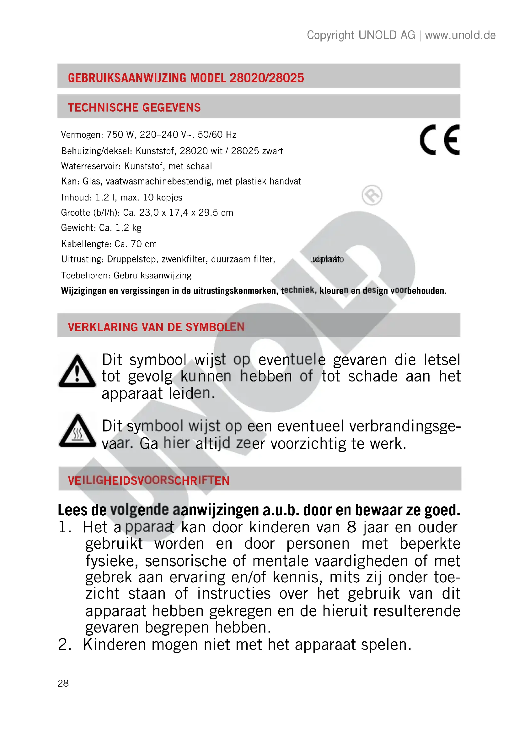 Onze apparaten zijn geproduceerd met een hoge qualiteit voor een lange gebruik. Regelmatige onderhoud en vakkundig reparaties door onze klantenservice verlengt de gebruiksduur. Wanneer het apparaat defect is en kan niet meer gerepareerd worden, let op de volgende instructies. Dit product mag niet samen met het normale huishoudelijke afval worden afgevoerd. U dient dit product bij een voor het recycleren van elektrische of elektronische apparaten aangewezen ver- zamelplaats in te leveren. Door het separaat inzamelen en recycleren van afvalproducten helpt u mee bij het zuinig omgaan met de natuurlijke hulpbronnen en zorgt u ervoor dat het product op een gezondheids- en milieuvriendelijke manier afgevoerd wordt. Copyright UNOLD AG | www.unold.de35 Potenza: 750 W, 220–240 V~, 50/60 Hz Corpo / Coperchio: Plastica, 28020 bianco / 28025 nero Recipiente per l’acqua: Plastica con indicatore di livello dell’acqua Brocca: Brocca in vetro con maniglia in plastica Volume: 1,2 l, max. 10 tazze Dimensioni (B/P/A): Ca. 23,0 x 17,4 x 29,5 cm Peso: Ca. 1,2 kg Lunghezza cavo: Ca. 70 cm, fisso Dotazione: Piastra termica, filtro permanente girevole con sistema antigoccia, pulsante di Acceso/Spento Accessori: Istruzioni per l’uso Con riserva di modifiche ed errori relativi a caratteristiche delle dotazioni, tecnica, colore e design.