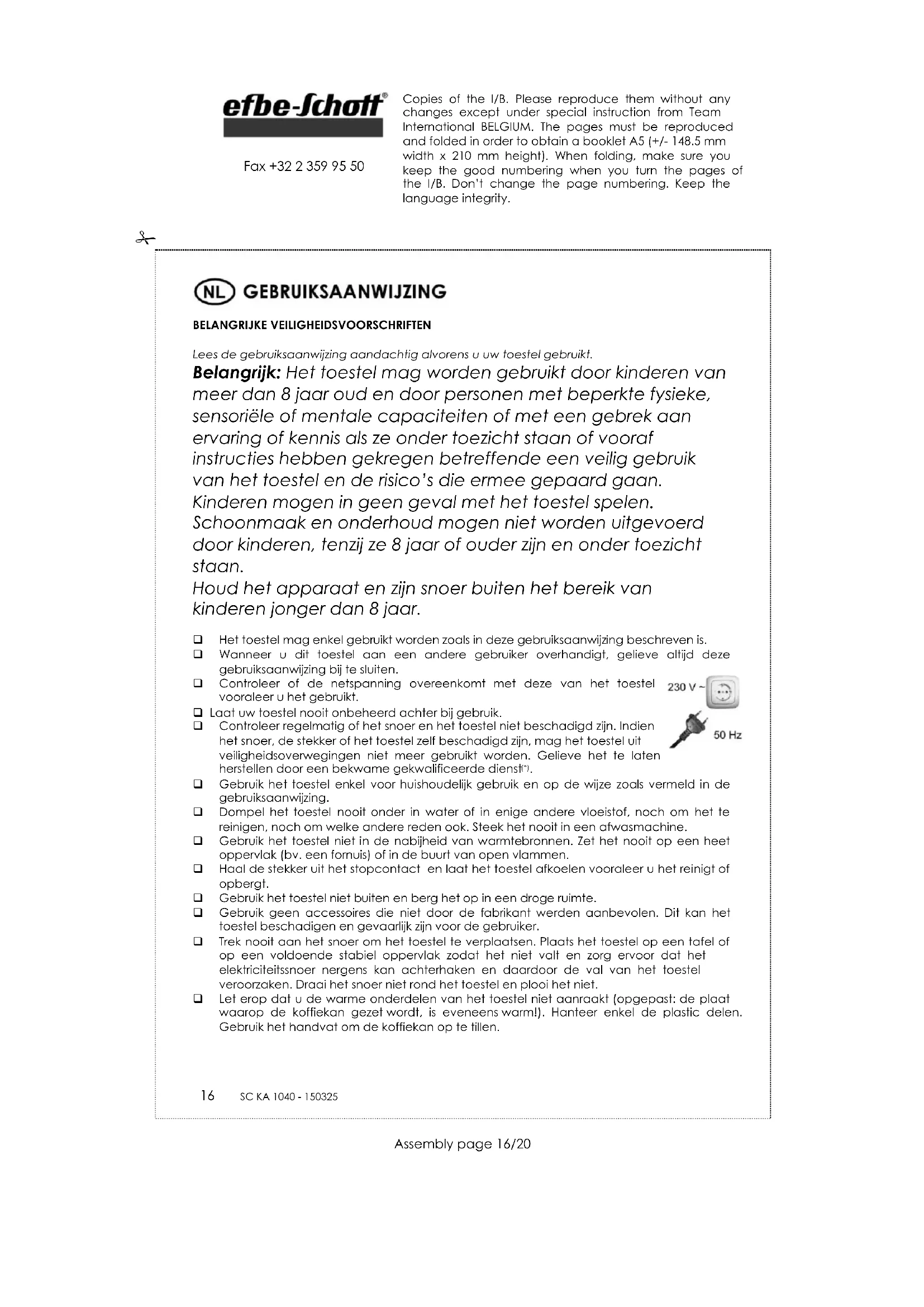 Om ons milieu en onze gezondheid te beschermen, moet afgedankte elektrische en elektronische apparatuur in overeenstemming met welbepaalde regels weggegooid worden. Dit vergt zowel de inzet van de leveranciers als van de gebruikers. Daarom mag uw apparaat, zoals op het typeplaatje of op de verpakking aangegeven door het symbool , niet met het gewone huisvuil weggegooid worden. De gebruiker heeft het recht het toestel gratis naar een gemeentelijk centrum van gescheiden inzameling te brengen waar het overeenkomstig de richtlijn hergebruikt, gerecycleerd of voor andere doeleinden gebruikt zal worden. Copies of the I/B. Please reproduce them without any changes except under special instruction from Team International BELGIUM. The pages must be reproduced and folded in order to obtain a booklet A5 (+/- 148.5 mm width x 210 mm height). When folding, make sure you keep the good numbering when you turn the pages of the I/B. Don’t change the page numbering. Keep the language integrity. 19 SC KA 1040 - 150325