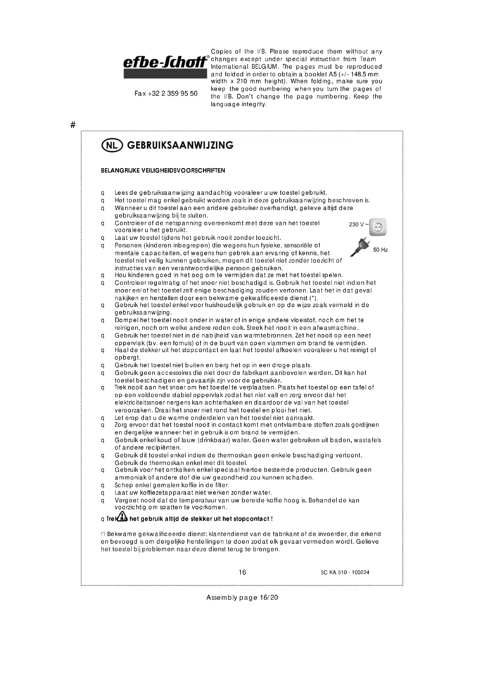 SC KA 510 - 100224 Assembly page 19/20 Fax +32 2 359 95 50 Defecte accessoires leiden niet tot het omruilen van het toestel, maar worden gratis vervangen. Gelieve in dit geval niet het toestel terug te sturen, maar enkel de defecte accessoires. Gebroken glas kan mits betaling vervangen worden. Accessoires die defect zijn wegens slijtage evenals reiniging, onderhoud of het vervangen van onderdelen die aan slijtage onderhevig zijn, worden niet door de waarborg gedekt en moeten dus betaald worden!