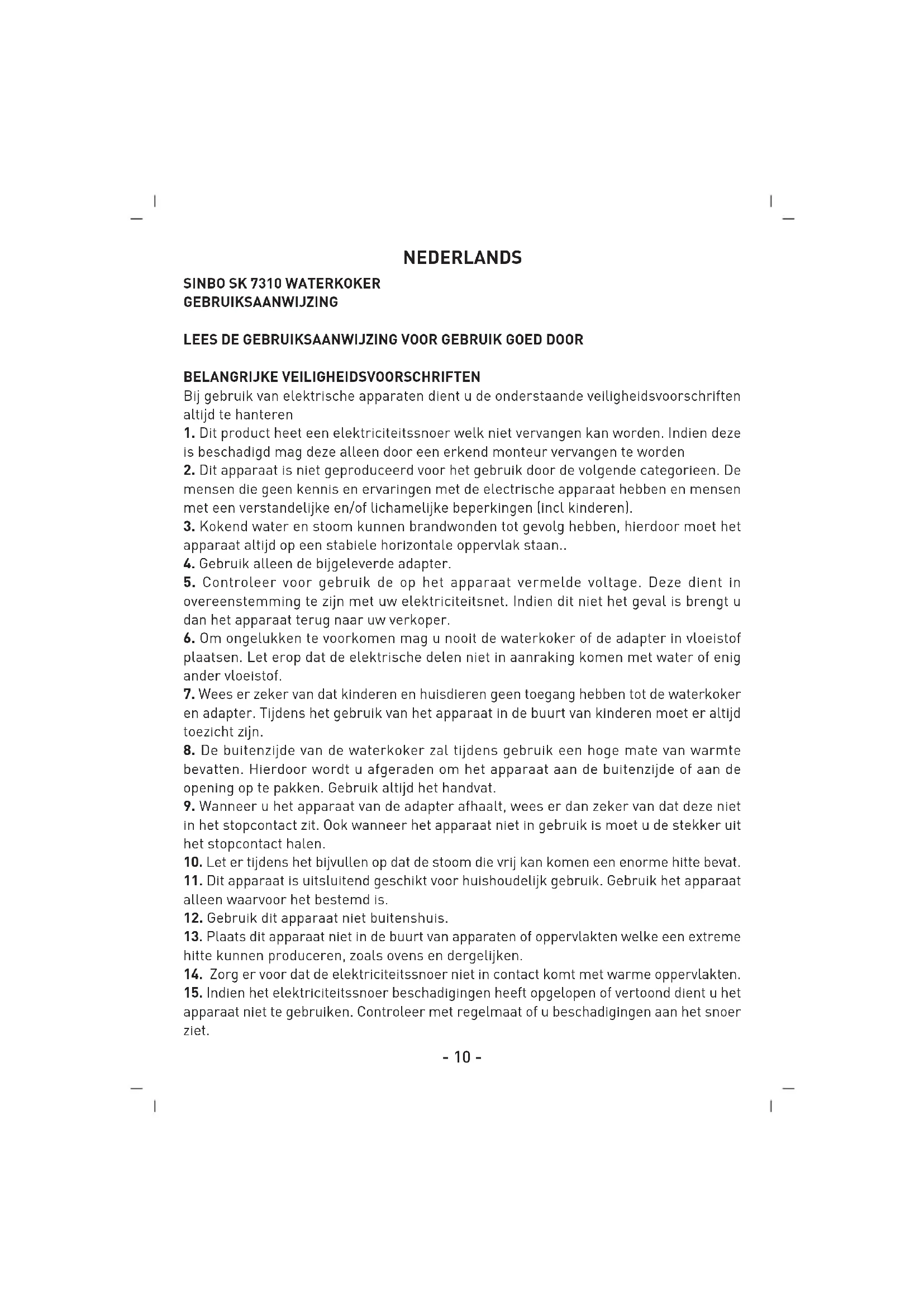 8. De buitenzijde van de waterkoker zal tijdens gebruik een hoge mate van warmte