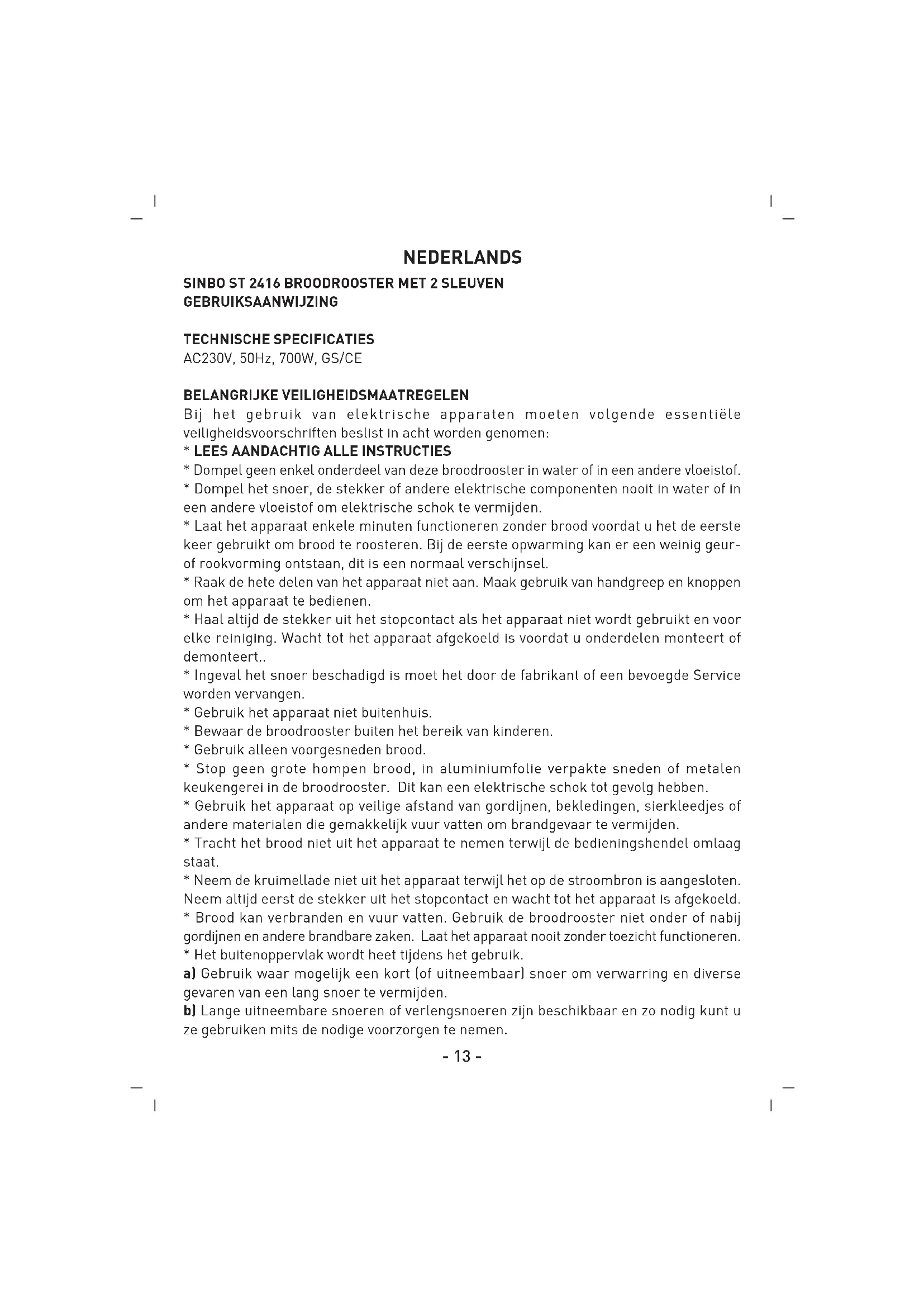 GEBRUIKSAANWIJZING ST 2416 SINBO