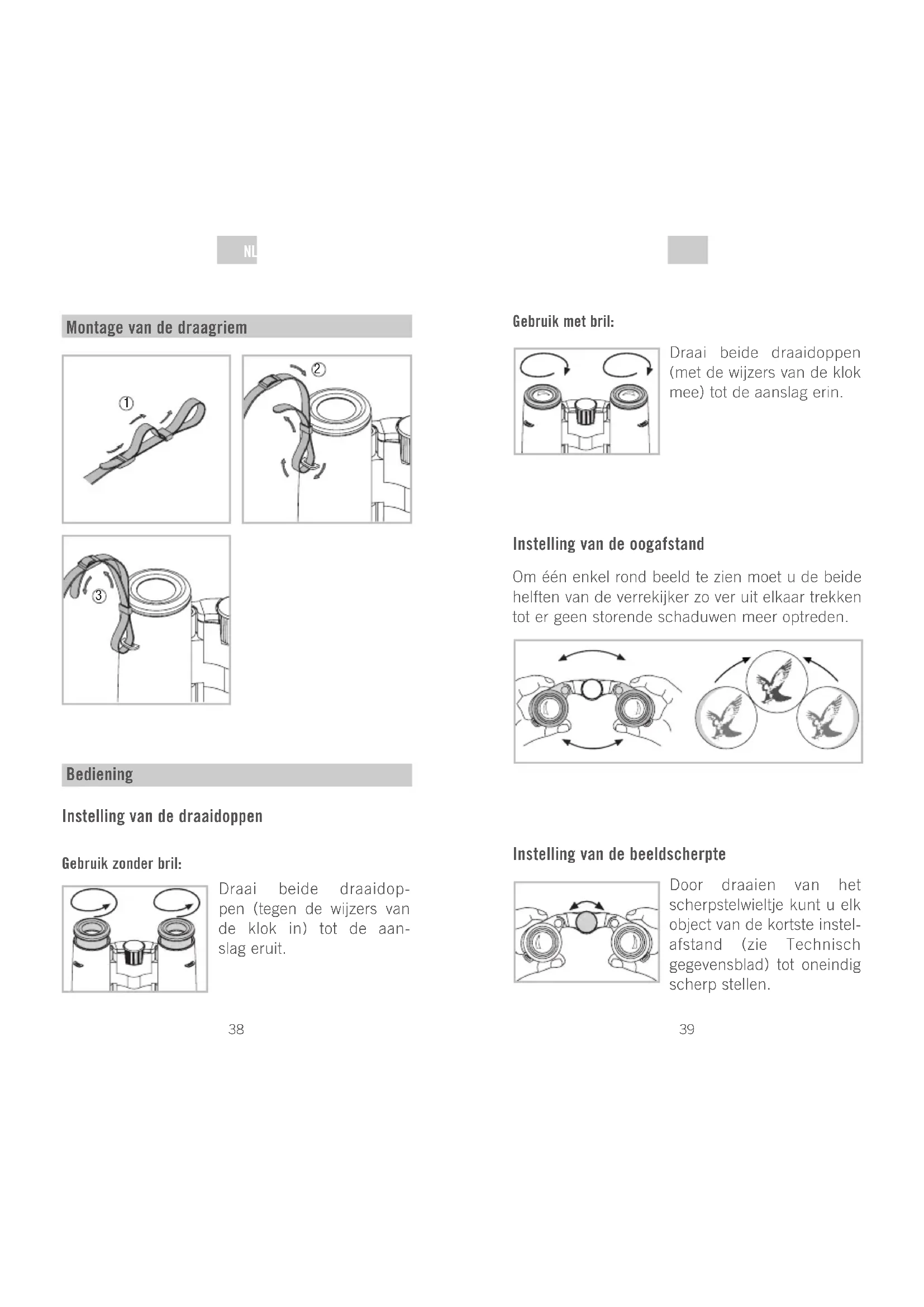DE NLNL Reiniging en onderhoud Reinigingsdoekje Met dit speciale doekje van microvezels kunt u zelfs de meest gevoelige glazen oppervlakken reinigen. Het is geschikt voor objectieven, oculai- ren en brillen. Houd het reinigingsdoekje a.u.b. schoon, omdat verontreinigingen het oppervlak van de lens kunnen beschadigen. Als het doekje vuil is, kunt u het in een handwarm zeepsopje wassen en aan de lucht laten drogen. Gebruik het a.u.b. uitsluitend voor het reinigen van glazen oppervlakken! Reiniging Wij hebben alle elementen en oppervlakken zo geconcipieerd dat ze eenvoudig te reinigen zijn. Om de optische briljantie van uw verrekijker duurzaam te waarborgen, moet u de glazen oppervlakken vrij van vuil, olie en vet houden. Verwijder voor het reinigen van de optiek eerst de grovere deeltjes met een speciaal kwastje voor optische instrumenten. Voor een hierop volgende grondige reiniging is het raadzaam de optiek een beetje te beademen en dan met het reinigings- doekje te reinigen. De behuizing onderhoudt u het beste met een zacht, vochtig poetsdoekje (niet het reinigings- doekje voor de optiek gebruiken). Dioptrie-correctie Om een optimale beeldkwaliteit te bereiken moet het eventueel verschillende gezichtsvermogen tussen het linker en het rechter oog worden gecompenseerd. Gebruik bij gelijk gezichtsvermogen van beide ogen: De dioptrie-correctie is ingesteld op „nul“. Gebruik bij verschillend gezichtsvermogen van beide ogen: