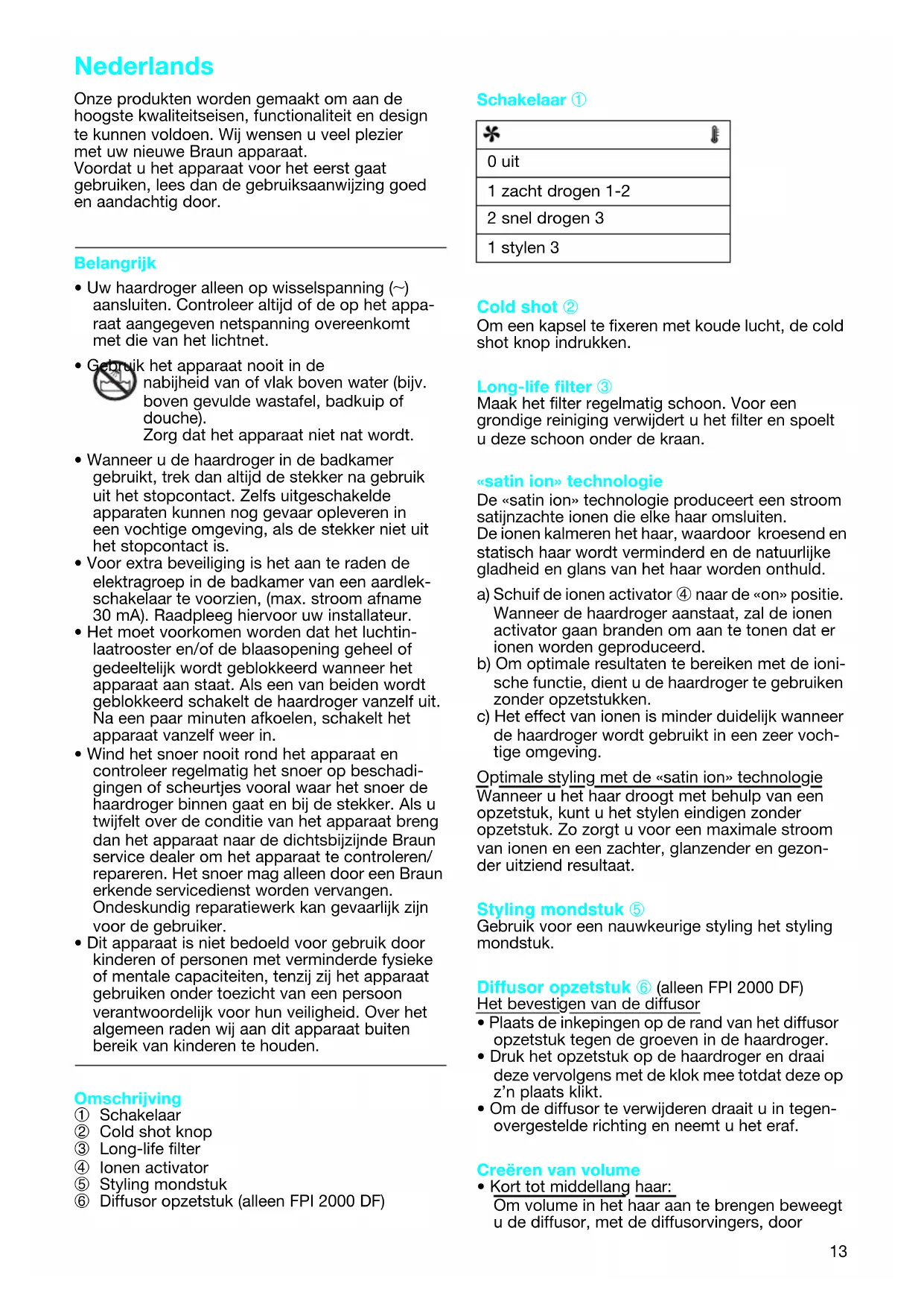 - Dit apparaat is niet bedoeld voor gebruik door kinderen of personen met verminderde fysieke of mentale capaciteiten, tenzij zij het apparaat gebruiken onder toezicht van een persoon verantwoordelijk voor hun veiligheid. Over het algemeen raden wij aan dit apparaat buiten bereik van kinderen te houden. Omschrijving 1 Schakelaar 2 Cold shot knop 3 Long-life filter 4 Ionen activator 5 Styling mondstuk 6 Diffusor opzetstuk (alleen FPI 2000 DF) Schakelaar 1 Cold shot 2 Om een kapsel te fixeren met koude lucht, de cold shot knop indrukken. Long-life filter 3 Maak het filter regelmatig schoon. Voor een grondige reiniging verwijdert u het filter en spoelt u deze schoon onder de kraan. «satin ion» technologie De «satin ion» technologie produceert een stroom satijnzachte ionen die elke haar omsluiten. De ionen kalmeren het haar, waardoor kroesend en statisch haar wordt verminderd en de natuurlijke gladheid en glans van het haar worden onthuld. a) Schuif de ionen activator 4 naar de «on» positie. Wanneer de haardroger aanstaat, zal de ionen activator gaan branden om aan te tonen dat er ionen worden geproduceerd. b) Om optimale resultaten te bereiken met de ioni- sche functie, dient u de haardroger te gebruiken zonder opzetstukken. c) Het effect van ionen is minder duidelijk wanneer de haardroger wordt gebruikt in een zeer voch- tige omgeving.