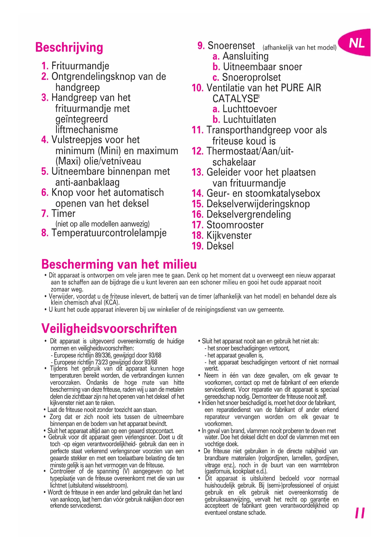 - Dit apparaat is ontworpen om vele jaren mee te gaan. Denk op het moment dat u overweegt een nieuw apparaataan te schaffen aan de bijdrage die u kunt leveren aan een schoner milieu en gooi het oude apparaat nooitzomaar weg.• Verwijder, voordat u de friteuse inlevert, de batterij van de timer (afhankelijk van het model) en behandel deze alsklein chemisch afval (KCA).• U kunt het oude apparaat inleveren bij uw winkelier of de reinigingsdienst van uw gemeente. Beschrijving