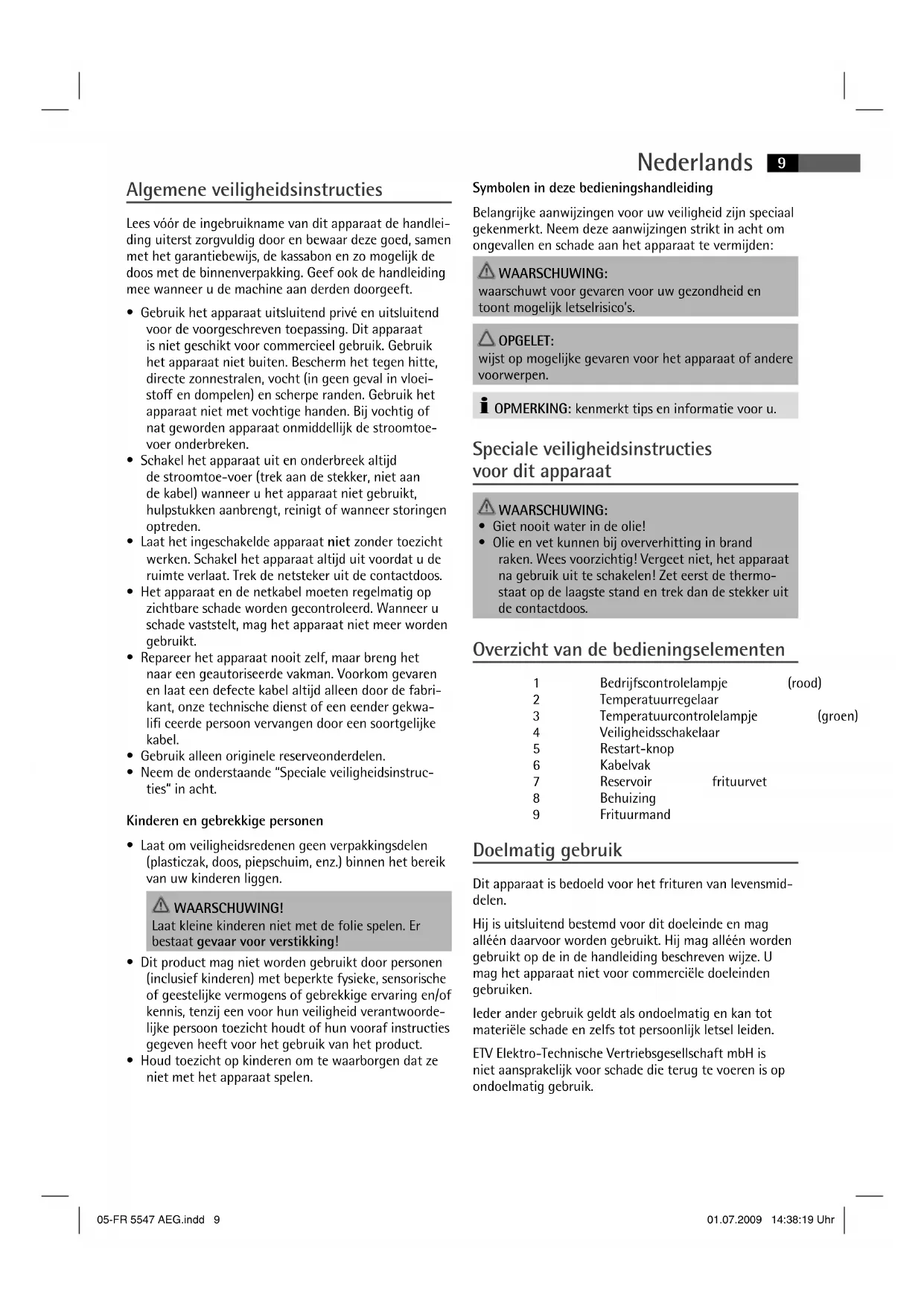 - Olie en vet kunnen bij oververhitting in brand raken. Wees voorzichtig! Vergeet niet, het apparaat na gebruik uit te schakelen! Zet eerst de thermo- staat op de laagste stand en trek dan de stekker uit de contactdoos. Overzicht van de bedieningselementen 1 Bedrijfscontrolelampje (rood) 2 Temperatuurregelaar 3 Temperatuurcontrolelampje (groen) 4 Veiligheidsschakelaar 5 Restart-knop 6 Kabelvak 7 Reservoir frituurvet 8 Behuizing 9 Frituurmand Doelmatig gebruik Dit apparaat is bedoeld voor het frituren van levensmid- delen. Hij is uitsluitend bestemd voor dit doeleinde en mag alléén daarvoor worden gebruikt. Hij mag alléén worden gebruikt op de in de handleiding beschreven wijze. U mag het apparaat niet voor commerciële doeleinden gebruiken. Ieder ander gebruik geldt als ondoelmatig en kan tot materiële schade en zelfs tot persoonlijk letsel leiden. ETV Elektro-Technische Vertriebsgesellschaft mbH is niet aansprakelijk voor schade die terug te voeren is op ondoelmatig gebruik. 05-FR 5547 AEG.indd 905-FR 5547 AEG.indd 9 01.07.2009 14:38:19 Uhr01.07.2009 14:38:19 UhrNederlands