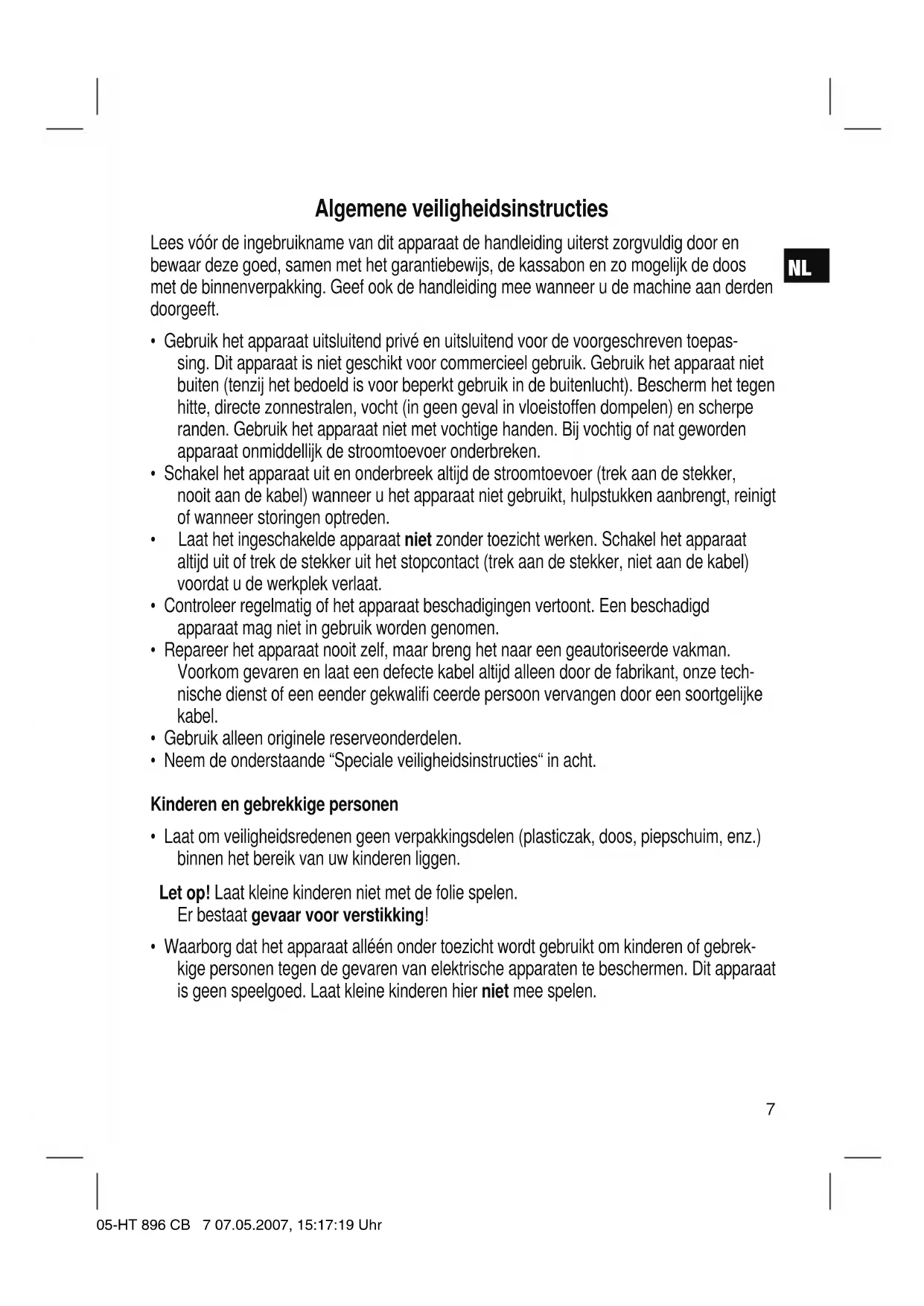- Waarborg dat het apparaat alléén onder toezicht wordt gebruikt om kinderen of gebrek- kige personen tegen de gevaren van elektrische apparaten te beschermen. Dit apparaat is geen speelgoed. Laat kleine kinderen hier niet mee spelen. 05-HT 896 CB 7 07.05.2007, 15:17:19 UhrNL