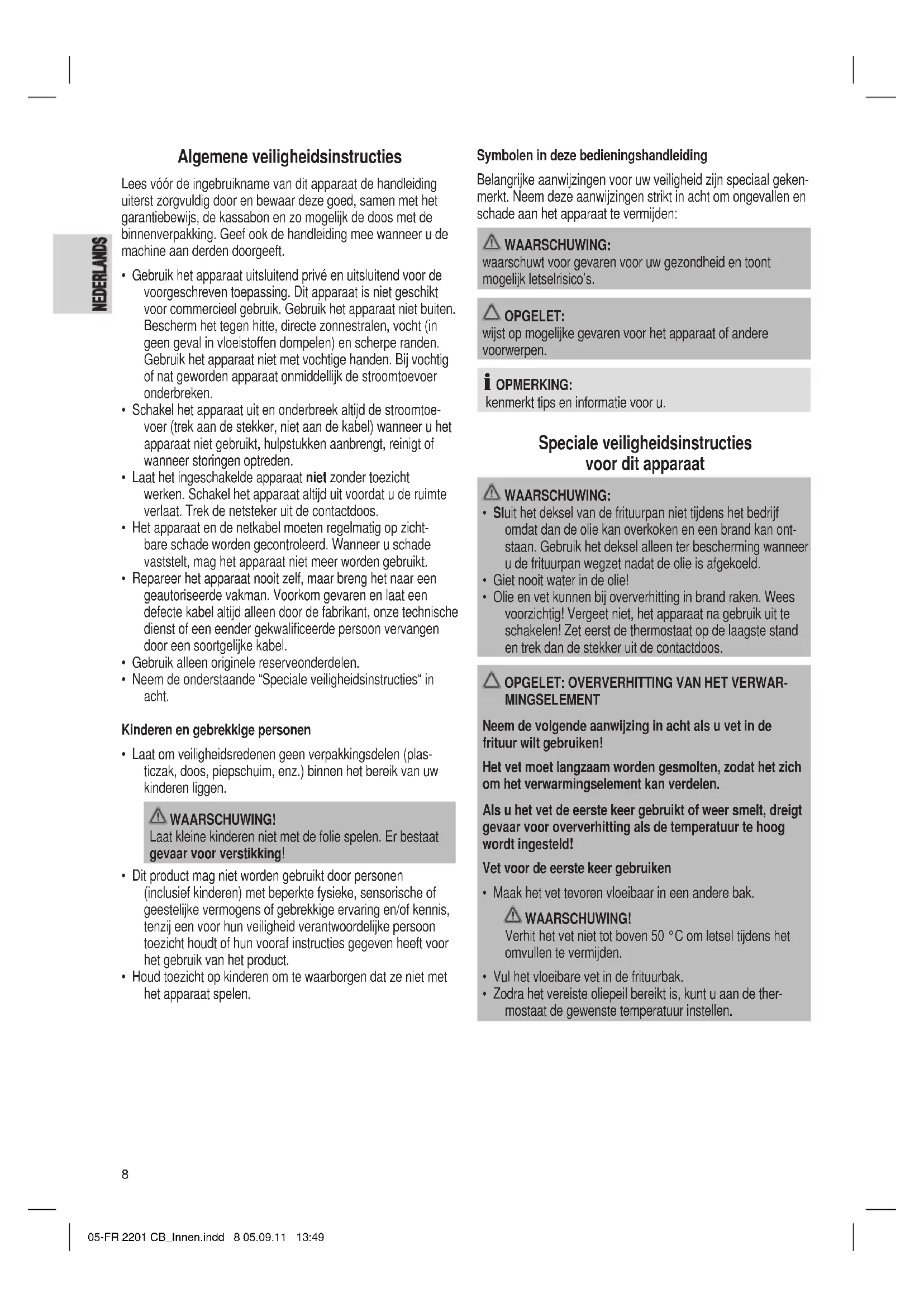 - Laat de frituurpan eerst volledig afkoelen voordat u op de rode „RESTART“-knop (5) aan de binnenzijde van het bestu- ringselement drukt om de frituurpan opnieuw te gebruiken. Gebruik daarvoor een minimaal 4 cm lang voorwerp van hout of kunststof. Technische gegevens Model: .........................................................................FR 2201 CB Spanningstoevoer: ....................................................230 V, 50 Hz Opgenomen vermogen: ....................................................2000 W Beschermingsklasse: ................................................................... Ι Volume: ........................................................................max. 3 liter Nettogewicht: .......................................................................2,8 kg Dit apparaat is gekeurd conform de op dit moment van toepas- sing zijnde CE-richtlijnen zoals bijvoorbeeld elektromagnetische compatibiliteit en laagspanningsvoorschriften en is gecon- strueerd volgens de nieuwste veiligheidstechnische voorschrif- ten. Technische wijzigingen voorbehouden! Betekenis van het symbool ‘vuilnisemmer’ Bescherm ons milieu, elektrische apparaten horen niet in het huisafval. Maak voor het afvoeren van elektrische apparaten gebruik van de voorgeschreven verzamelpunten en geef daar de elektrische apparaten af die u niet meer gebruikt. Daardoor helpt u de potentiële effecten te voorkomen die een verkeerde afvoer op het milieu en de menselijke gezondheid kunnen hebben. Op deze wijze levert u uw bijdrage aan het hergebruik, de recycling en andere verwerkingsvormen voor oude elektronische en elektrische apparaten. Voor informatie over verzamelpunten voor uw apparaten kunt u contact opnemen met uw gemeente of gemeenteadministratie. 05-FR 2201 CB_Innen.indd 10 05.09.11 13:4911 FRANÇAIS Conseils généraux de sécurité Lisez attentivement ce mode d’emploi avant de mettre l’appareil en marche pour la première fois. Conservez le mode d’emploi ainsi que le bon de garantie, votre ticket de caisse et si possible, le carton avec l’emballage se trouvant à l’intérieur. Si vous remettez l‘appareil à des tiers, veuillez-le remettre avec son mode d‘emploi.