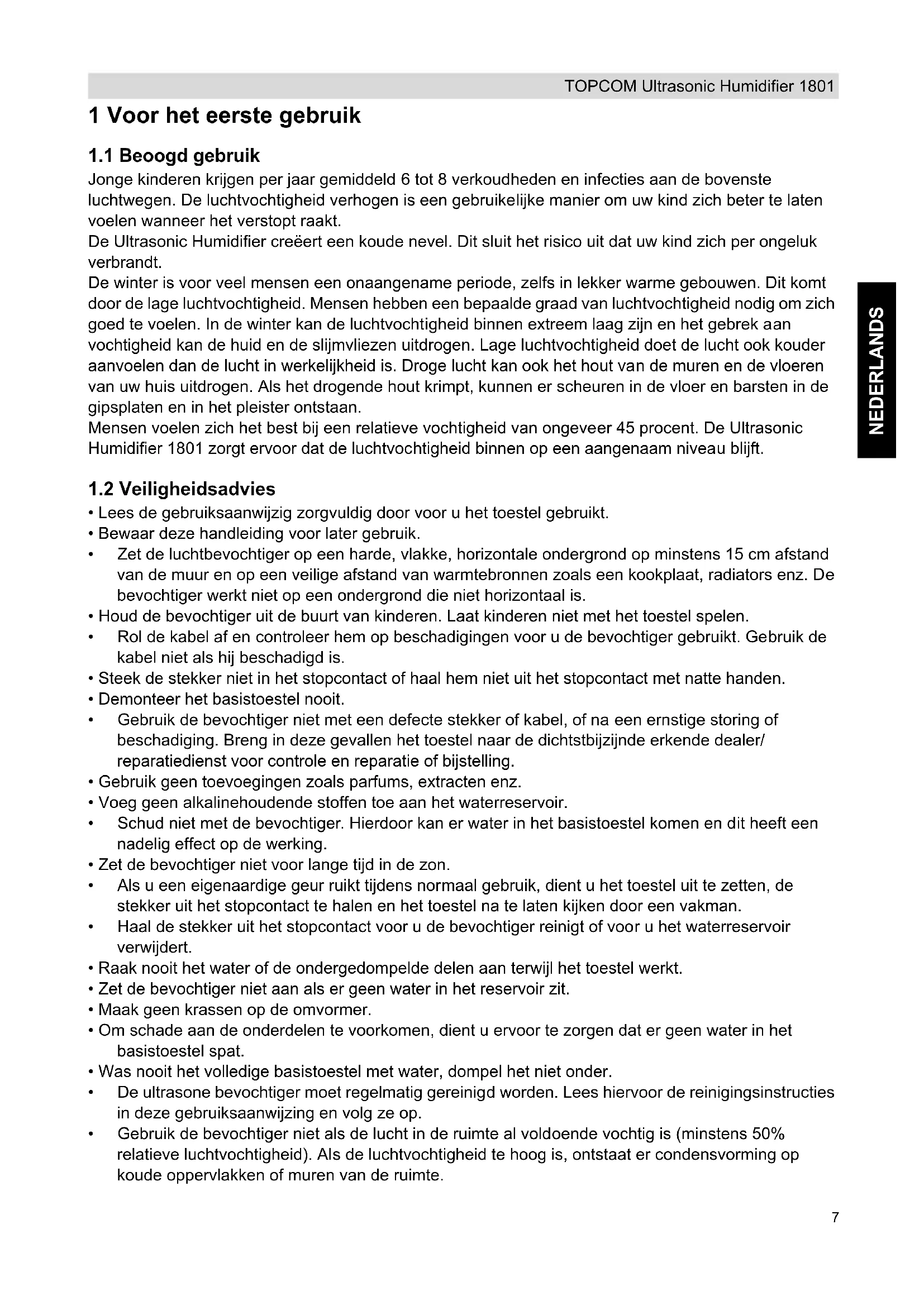 - Gebruik de bevochtiger niet als de lucht in de ruimte al voldoende vochtig is (minstens 50% relatieve luchtvochtigheid). Als de luchtvochtigheid te hoog is, ontstaat er condensvorming op koude oppervlakken of muren van de ruimte. HL_Ultrasonic Humidifier 1801 D106.book Page 7 Sunday, May 29, 2011 7:33 PM8 TOPCOM Ultrasonic Humidifier 1801 2 Technische specificaties – Bevochtigingscapaciteit: 300 ml/h – Volume waterreservoir: 6 l – Nominaal voltage: 230 V AC – Nominale frequentie: 50 Hz – Nominaal vermogen: 50 W – Bescherming tegen elektrische schokken: klasse II 3 Beschrijving a. Handgreep b. Watertoevoerdop c. Detector laag waterniveau d. Elektriciteitskabel e. Toetsenbord f. LCD-display g. Waterafvoerkanaal h. Waterreservoir