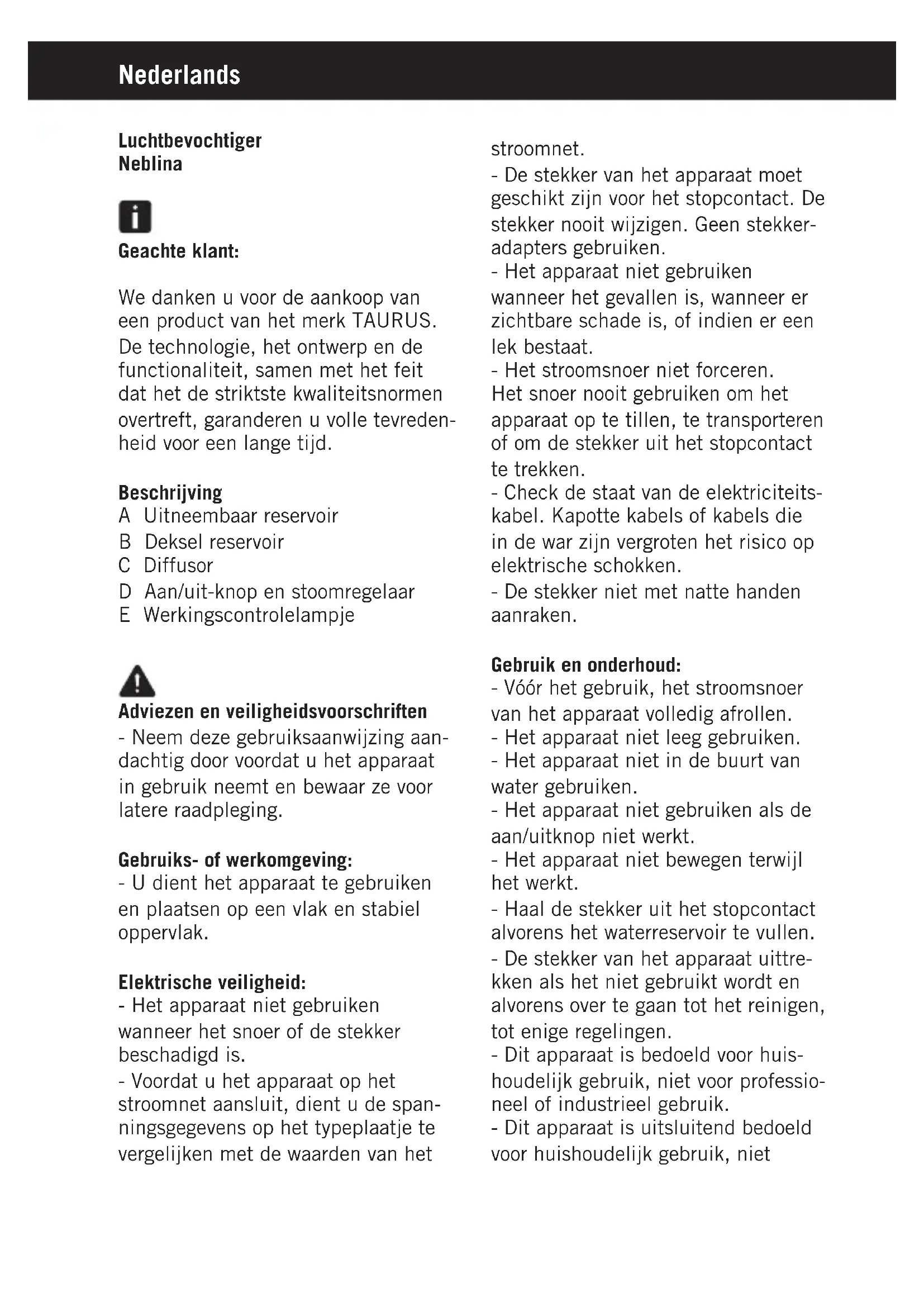 Download de handleiding voor uw Luchtbevochtiger in PDF-formaat gratis! Vind uw handleiding NEBLINA - TAURUS en neem uw elektronisch apparaat weer in handen. Op deze pagina staan alle documenten die nodig zijn voor het gebruik van uw apparaat. NEBLINA van het merk TAURUS.