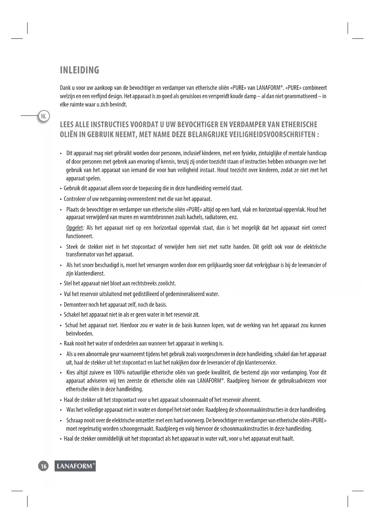 INLEIDING Dank u voor uw aankoop van de bevochtiger en verdamper van etherische oliën «PURE» van LANAFORM®. «PURE» combineert welzijn en een verjnd design. Het apparaat is zo goed als geruisloos en verspreidt koude damp – al dan niet gearomatiseerd – in elke ruimte waar u zich bevindt. LEES ALLE INSTRUCTIES VOORDAT U UW BEVOCHTIGER EN VERDAMPER VAN ETHERISCHE OLIËN IN GEBRUIK NEEMT, MET NAME DEZE BELANGRIJKE VEILIGHEIDSVOORSCHRIFTEN :
