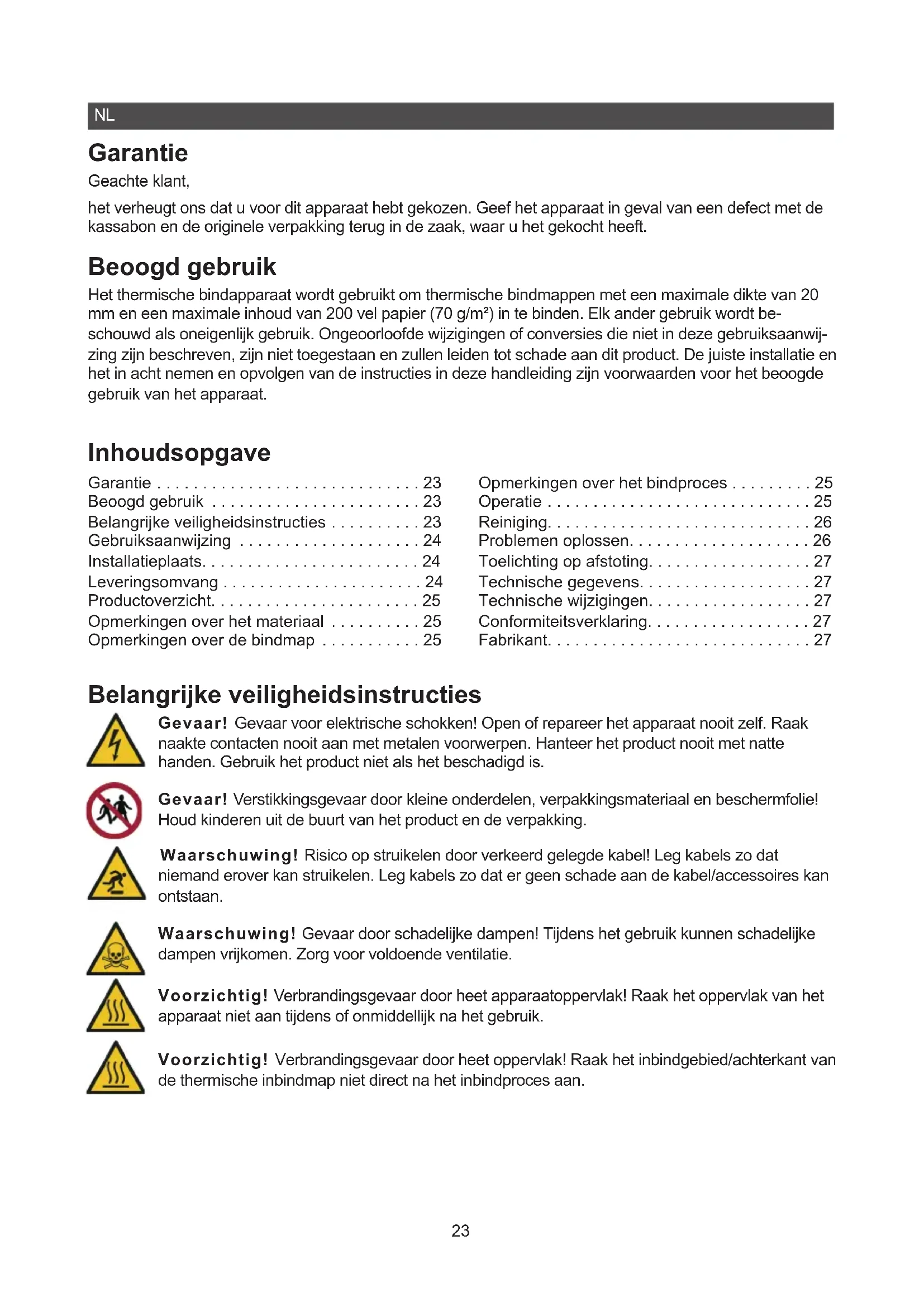 - Fabrikant Belangrijke veiligheidsinstructies Gevaar! Gevaar voor elektrische schokken! Open of repareer het apparaat nooit zelf. Raak naakte contacten nooit aan met metalen voorwerpen. Hanteer het product nooit met natte handen. Gebruik het product niet als het beschadigd is. Gevaar! Verstikkingsgevaar door kleine onderdelen, verpakkingsmateriaal en beschermfolie! Houd kinderen uit de buurt van het product en de verpakking. Waarschuwing! Risico op struikelen door verkeerd gelegde kabel! Leg kabels zo dat niemand erover kan struikelen. Leg kabels zo dat er geen schade aan de kabel/accessoires kan ontstaan. Waarschuwing! Gevaar door schadelijke dampen! Tijdens het gebruik kunnen schadelijke dampen vrijkomen. Zorg voor voldoende ventilatie. Voorzichtig! Verbrandingsgevaar door heet apparaatoppervlak! Raak het oppervlak van het apparaat niet aan tijdens of onmiddellijk na het gebruik. Voorzichtig! Verbrandingsgevaar door heet oppervlak! Raak het inbindgebied/achterkant van de thermische inbindmap niet direct na het inbindproces aan.24 Opgelet! Materiële schade door verkeerde bediening! Gebruik alleen thermische bindmappen die voldoen aan de eisen onder Technische gegevens. Opgelet! Materiële schade mogelijk! Als het product ongewone kenmerken vertoont, zoals lawaai, geur of rook, moet u de voeding onmiddellijk uitschakelen. Opgelet! Materiële schade mogelijk! Het kan niet worden uitgesloten dat sommige verven, kunststoen of meubelverzorgingsproducten het materiaal van de antislipvoeten aantasten en zachter maken. Leg indien nodig een antislipmat onder het apparaat om vlekken op meubels te voorkomen. Gebruiksaanwijzing Lees deze gebruiksaanwijzing voordat u het product aansluit en gebruikt. Bewaar deze gebruiksaanwijzing voor toekomstig gebruik. Overhandig alle documenten wanneer je het product doorgeeft aan derden. p. 27