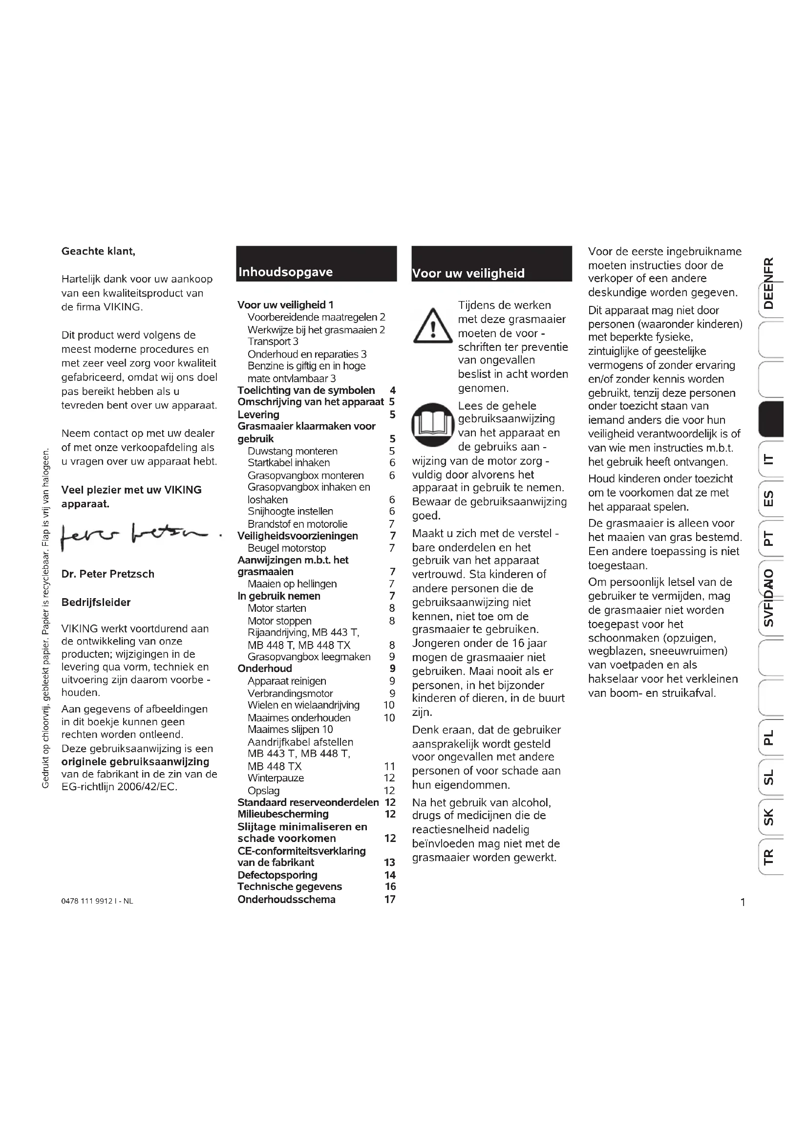 Tijdens de werken met deze grasmaaier moeten de voor - schriften ter preventie van ongevallen beslist in acht worden genomen. Lees de gehele gebruiksaanwijzing van het apparaat en de gebruiks aan - wijzing van de motor zorg - vuldig door alvorens het apparaat in gebruik te nemen. Bewaar de gebruiksaanwijzing goed. Maakt u zich met de verstel - bare onderdelen en het gebruik van het apparaat vertrouwd. Sta kinderen of andere personen die de gebruiksaanwijzing niet kennen, niet toe om de grasmaaier te gebruiken. Jongeren onder de 16 jaar mogen de grasmaaier niet gebruiken. Maai nooit als er personen, in het bijzonder kinderen of dieren, in de buurt zijn. Denk eraan, dat de gebruiker aansprakelijk wordt gesteld voor ongevallen met andere personen of voor schade aan hun eigendommen. Na het gebruik van alcohol, drugs of medicijnen die de reactiesnelheid nadelig beïnvloeden mag niet met de grasmaaier worden gewerkt. Geachte klant, Hartelijk dank voor uw aankoop van een kwaliteitsproduct van de firma VIKING. Dit product werd volgens de meest moderne procedures en met zeer veel zorg voor kwaliteit gefabriceerd, omdat wij ons doel pas bereikt hebben als u tevreden bent over uw apparaat. Neem contact op met uw dealer of met onze verkoopafdeling als u vragen over uw apparaat hebt. Veel plezier met uw VIKING apparaat. Dr. Peter Pretzsch Bedrijfsleider VIKING werkt voortdurend aan de ontwikkeling van onze producten; wijzigingen in de levering qua vorm, techniek en uitvoering zijn daarom voorbe - houden. Aan gegevens of afbeeldingen in dit boekje kunnen geen rechten worden ontleend. Deze gebruiksaanwijzing is een originele gebruiksaanwijzing van de fabrikant in de zin van de EG-richtlijn 2006/42/EC. Inhoudsopgave Voor uw veiligheid 1 Voorbereidende maatregelen 2 Werkwijze bij het grasmaaien 2 Transport 3 Onderhoud en reparaties 3 Benzine is giftig en in hoge mate ontvlambaar 3 Toelichting van de symbolen 4 Omschrijving van het apparaat 5 Levering 5 Grasmaaier klaarmaken voor gebruik 5 Duwstang monteren 5 Startkabel inhaken 6 Grasopvangbox monteren 6 Grasopvangbox inhaken en loshaken 6 Snijhoogte instellen 6 Brandstof en motorolie 7 Veiligheidsvoorzieningen 7 Beugel motorstop 7 Aanwijzingen m.b.t. het grasmaaien 7 Maaien op hellingen 7 In gebruik nemen 7 Motor starten 8 Motor stoppen 8 Rijaandrijving, MB 443 T, MB 448 T, MB 448 TX 8 Grasopvangbox leegmaken 9 Onderhoud 9 Apparaat reinigen 9 Verbrandingsmotor 9 Wielen en wielaandrijving 10 Maaimes onderhouden 10 Maaimes slijpen 10 Aandrijfkabel afstellen MB 443 T, MB 448 T, MB 448 TX 11 Winterpauze 12 Opslag 12 Standaard reserveonderdelen 12 Milieubescherming 12 Slijtage minimaliseren en schade voorkomen 12 CE-conformiteitsverklaring van de fabrikant 13 Defectopsporing 14 Technische gegevens 16 Onderhoudsschema 17 Voor uw veiligheid Voor de eerste ingebruikname moeten instructies door de verkoper of een andere deskundige worden gegeven. Dit apparaat mag niet door personen (waaronder kinderen) met beperkte fysieke, zintuiglijke of geestelijke vermogens of zonder ervaring en/of zonder kennis worden gebruikt, tenzij deze personen onder toezicht staan van iemand anders die voor hun veiligheid verantwoordelijk is of van wie men instructies m.b.t. het gebruik heeft ontvangen. Houd kinderen onder toezicht om te voorkomen dat ze met het apparaat spelen. De grasmaaier is alleen voor het maaien van gras bestemd. Een andere toepassing is niet toegestaan. Om persoonlijk letsel van de gebruiker te vermijden, mag de grasmaaier niet worden toegepast voor het schoonmaken (opzuigen, wegblazen, sneeuwruimen) van voetpaden en als hakselaar voor het verkleinen van boom- en struikafval. Gedrukt op chloorvrij, gebleekt papier. Papier is recyclebaar. Flap is vrij van halogeen.2 0478 111 9912 I - NL