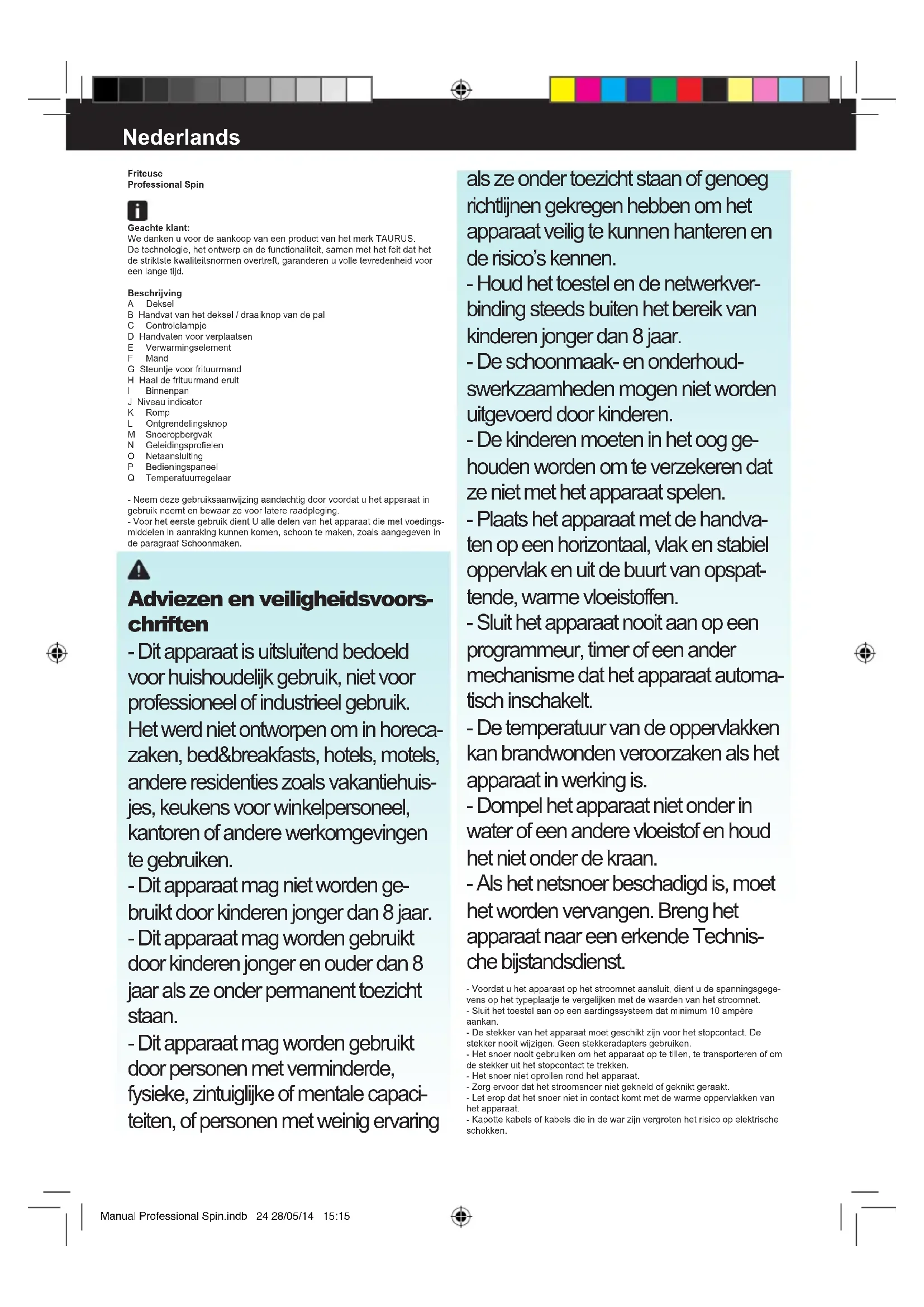 ADVERTÊNCIA: não retirar a tampa enquanto a cesta estiver a girar. Ter cuidado ao retirar a tampa para evitar o contacto acidental com quais- quer restos de óleo quente que possam permanecer na parte interior. Uma vez terminada a utilização do aparelho: - Seleccionar a posição mínima (MIN) através do comando selector de temperatura - Desligar o aparelho da rede eléctrica. - Recolher o cabo e colocá-lo no seu alojamento. - Colocar a cesta na cuba. -Aasadacestapodecarxadaoupodedobrar-separaacesta,pressionan- do a barra para o lado e girando-a. - Colocar a tampa no aparelho. Compartimento do cabo - Este aparelho dispõe de um alojamento para o cabo de ligação à corrente, situado na parte inferior. Asa(s) de Transporte: - Este aparelho dispõe de uma asa na sua parte lateral para o transporte ser fácil e cómodo. Conselhos práticos: - Para retirar os odores do óleo frite alguns pedaços de pão. - Nos alimentos que contenham muita água, é melhor e mais rápido realizar duas frituras com menos quantidade do que uma única fritura. Este sistema consiste em realizar uma primeira fritura até que os alimentos estejam bem cozidos, e depois fazer uma segunda fritura para dourar os alimentos, com o óleo bem quente. - É aconselhável fritar com azeite de oliva de acidez mínima. - Não misturar diferentes tipos de óleo. - Para evitar que as batatas se peguem, é conveniente lavá-las antes de as fritar. Protector térmico de segurança: - O aparelho dispõe de um dispositivo térmico de segurança que o protege de qualquer sobreaquecimento. - Em caso de sobreaquecimento actuará o dispositivo de segurança térmica e o aparelho deixará de funcionar. Quando isto acontecer, deverá desligar o aparelho da rede eléctrica e deixá-lo arrefecer. Posteriormente, prima o botão de reposição que está situado na parte posterior do conjunto eléctrico com a ponta de uma caneta ou outro objecto semelhante, de modo a preparar de novo o aparelho para o funcionamento (Fig.5). Limpeza - Desligar o aparelho da rede eléctrica e deixá-lo arrefecer antes de iniciar qualquer operação de limpeza. - Desmontar o aparelho de acordo com os seguintes passos: Retirar a tampa Retirar a cesta e extrair o conjunto eléctrico Extrair a cuba Verter cuidadosamente o óleo já utilizado da cuba para um recipiente (não dei- te para o ralo), de acordo com a norma vigente para o tratamento e eliminação de residuos. Girar o corpo da fritadeira e desinstalar o cabo eléctrico da base, pressionando o aro e retirando-o para fora. Extrair o cabo de alimentação do respectivo Manual Professional Spin.indb 22 28/05/14 15:15alojamento e separar o conjunto completo da fritadeira. - Com excepção do conjunto eléctrico e do cabo eléctrico, todas as peças podem ser limpas com detergente e água ou na máquina de lavar louça. Limpar o aparelho e o cabo eléctrico com um pano húmido e secá-los de seguida. NUNCA SUBMERGIR O APARELHO OU O CABO ELÉCTRICO EM ÁGUA OU EM QUALQUER OUTRO LÍQUIDO. - Limpar o aparelho com um pano húmido com algumas gotas de detergente e secá-lo de seguida. - Não utilizar solventes, produtos com um factor pH ácido ou básico como a lixívia nem produtos abrasivos para a limpeza do aparelho. - Recomenda-se limpar o aparelho regularmente e retirar todos os restos de alimentos. As seguintes peças podem ser lavadas em água quente com sabão ou na máquina de lavar louça (usando um programa suave de lavagem): - Cesta - Cuba - Seque o produto imediatamente após qualquer operação de limpeza, assegurando-se de que a base do conector do produto se encontra perfeita- mente seca. - Secar todas as peças antes de montar e guardar o aparelho. Anomalias e reparação - Em caso de avaria, levar o aparelho a um Serviço de Assistência Técnica autorizado. Não o tente desmontar ou reparar, já que pode ser perigoso. Para produtos da União Europeia e/ou conforme os requisitos da regulamen- tação do seu país de origem: Ecologia e reciclabilidade do produto - Os materiais que constituem a embalagem deste aparelho estão integrados numsistemaderecolha,classicaçãoereciclagem.Casodesejedesfazer-se deles, pode utilizar os contentores públicos apropriados para cada tipo de material. - O produto está isento de concentrações de substâncias que podem ser consideradas nocivas para o ambiente. Estesímbolosignicaquesedesejardesfazer-sedoproduto depois de terminada a sua vida útil, deve entregá-lo através dos meios adequados ao cuidado de um gestor de resíduos autorizado para a recolha selectiva de Resíduos de Equipamentos Eléctricos e Electrónicos (REEE). Este aparelho cumpre a Directiva 2006/95/CE de Baixa Tensão, a Directiva 2004/108/CE de Compatibilidade Electromagnética, a Directiva 2011/65/CE sobre restrições à utilização de determinadas substâncias perigosas em apare- lhos eléctricos e electrónicos e a Directiva 2009/125/CE sobre os requisitos de design ecológico aplicável aos produtos relacionados com a energia. Manual Professional Spin.indb 23 28/05/14 15:15Nederlands Friteuse Professional Spin Geachte klant: We danken u voor de aankoop van een product van het merk TAURUS. De technologie, het ontwerp en de functionaliteit, samen met het feit dat het de striktste kwaliteitsnormen overtreft, garanderen u volle tevredenheid voor een lange tijd. Beschrijving A Deksel B Handvat van het deksel / draaiknop van de pal C Controlelampje D Handvaten voor verplaatsen E Verwarmingselement F Mand G Steuntje voor frituurmand H Haal de frituurmand eruit I Binnenpan J Niveau indicator K Romp L Ontgrendelingsknop M Snoeropbergvak N Geleidingsproelen O Netaansluiting P Bedieningspaneel Q Temperatuurregelaar - Neem deze gebruiksaanwijzing aandachtig door voordat u het apparaat in gebruik neemt en bewaar ze voor latere raadpleging. - Voor het eerste gebruik dient U alle delen van het apparaat die met voedings- middelen in aanraking kunnen komen, schoon te maken, zoals aangegeven in de