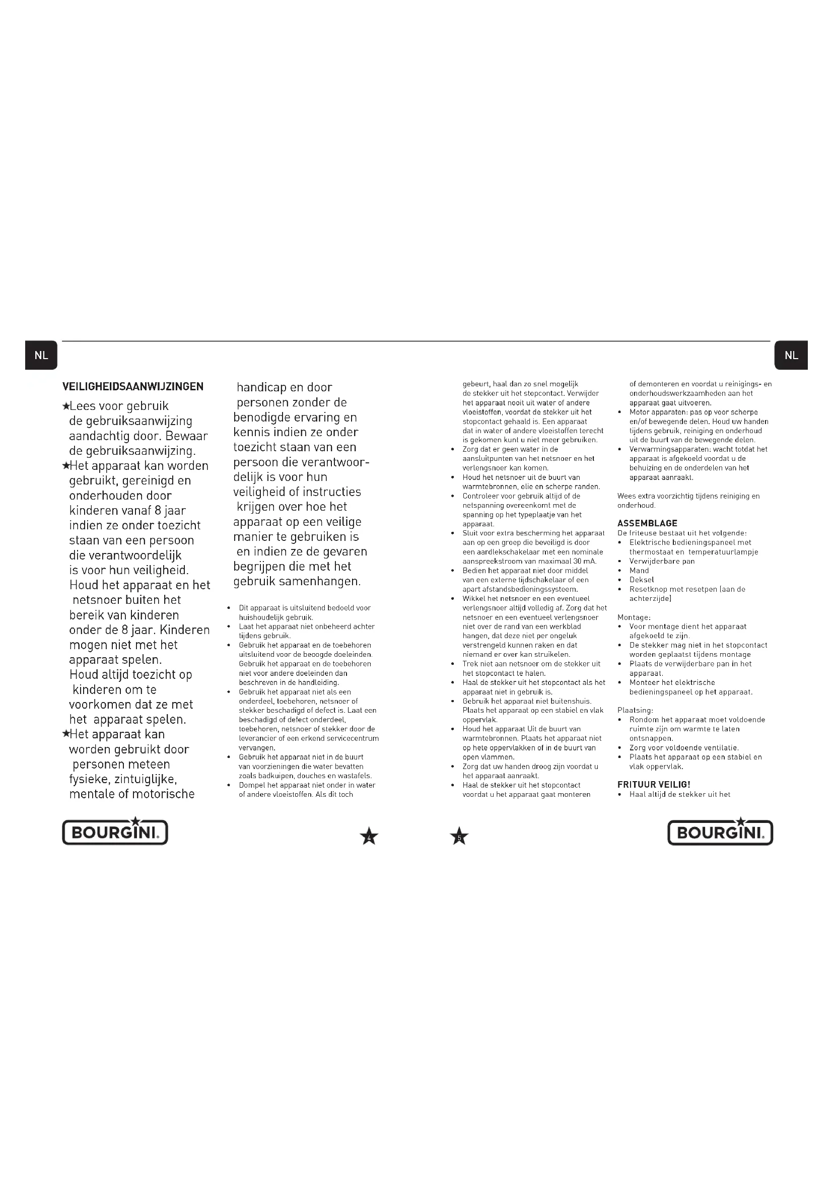 © THE BOURGINI COMPANY B.V. WWW.BOURGINI.COMVEILIGHEIDSAANWIJZINGEN Lees voor gebruik de gebruiksaanwijzing aandachtig door. Bewaar de gebruiksaanwijzing. Het apparaat kan worden gebruikt, gereinigd en onderhouden door kinderen vanaf 8 jaar indien ze onder toezicht staan van een persoon die verantwoordelijk is voor hun veiligheid. Houd het apparaat en het netsnoer buiten het bereik van kinderen onder de 8 jaar. Kinderen mogen niet met het apparaat spelen. Houd altijd toezicht op kinderen om te voorkomen dat ze met het apparaat spelen. Het apparaat kan worden gebruikt door personen meteen fysieke, zintuiglijke, mentale of motorische handicap en door personen zonder de benodigde ervaring en kennis indien ze onder toezicht staan van een persoon die verantwoor- delijk is voor hun veiligheid of instructies krijgen over hoe het apparaat op een veilige manier te gebruiken is en indien ze de gevaren begrijpen die met het gebruik samenhangen.