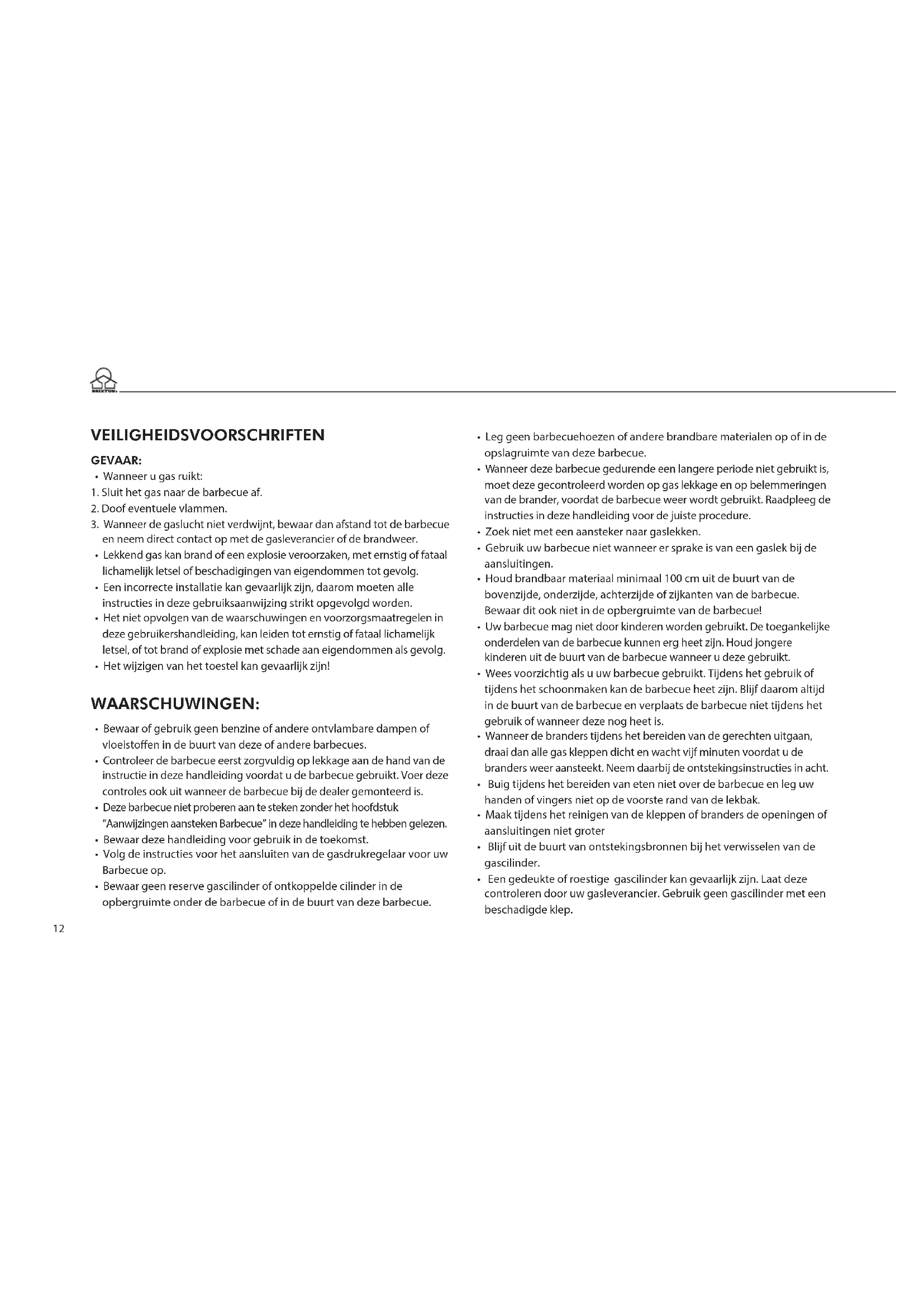Waar kan ik een goedgekeurde en voor deze Brixton barbecue geschikte gases kopen? Bij uw plaatselijke gasleverancier en bij iedere grote kampeervakhandel. Kan de barbecue in weer en wind buiten blijven staan? U kunt uw barbecue het beste na gebruik op een droge en goed geventileerde plaats opbergen. Koppel altijd de gases los, zoals beschreven in deze handleiding. Tevens kunt u een beschermhoes aanschaen. Deze zijn verkrijgbaar bij uw verkooppunt. Er zijn barbecue onderdelen beschadigd of niet aanwezig na het openen van de verpakking, wat nu te doen? Neem contact op met Tristar (www.tristar.service.eu) zij zullen u verder helpen. Kunnen de grill en/of bakplaten in de afwasmachine? Dit is mogelijk, echter het schoonmaken met een barbecue reinigingsmiddel of sopje volstaat ook. Er lekt vet onder in de barbecue en/of op de ondergrond, wat nu te doen? Reinig de barbecue en de ondergrond. Verplaats uw barbecue naar een vlakke en rechte ondergrond. Zorg er tevens voor dat u regelmatig de vetopvang bak leegt.21