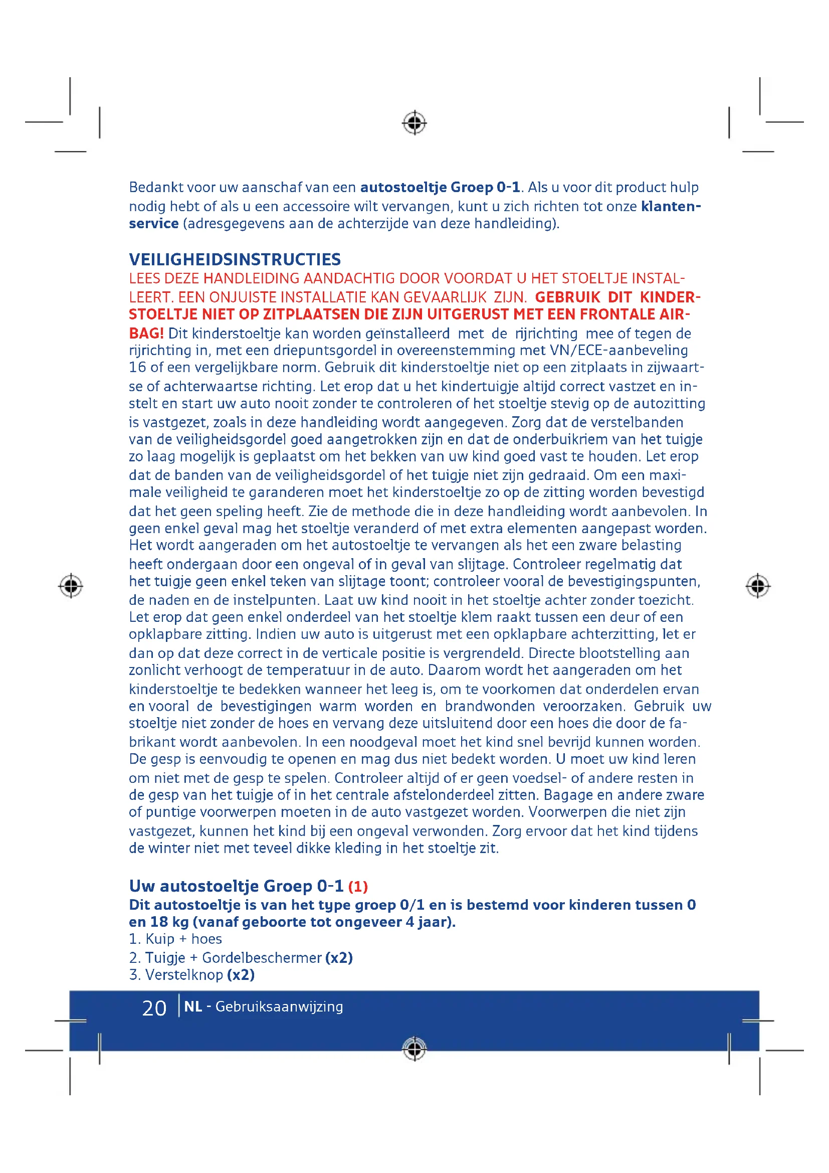 - Wenden Sie sich in Zweifelsfällen an den Hersteller des Rückhaltesystems oder an Ihren Händler.20 NL - Gebruiksaanwijzing Bedankt voor uw aanschaf van een autostoeltje Groep 0-1. Als u voor dit product hulp nodig hebt of als u een accessoire wilt vervangen, kunt u zich richten tot onze klanten- service (adresgegevens aan de achterzijde van deze handleiding). VEILIGHEIDSINSTRUCTIES LEES DEZE HANDLEIDING AANDACHTIG DOOR VOORDAT U HET STOELTJE INSTAL- LEERT. EEN ONJUISTE INSTALLATIE KAN GEVAARLIJK ZIJN. GEBRUIK DIT KINDER- STOELTJE NIET OP ZITPLAATSEN DIE ZIJN UITGERUST MET EEN FRONTALE AIR- BAG! Dit kinderstoeltje kan worden geïnstalleerd met de rijrichting mee of tegen de rijrichting in, met een driepuntsgordel in overeenstemming met VN/ECE-aanbeveling 16 of een vergelijkbare norm. Gebruik dit kinderstoeltje niet op een zitplaats in zijwaart- se of achterwaartse richting. Let erop dat u het kindertuigje altijd correct vastzet en in- stelt en start uw auto nooit zonder te controleren of het stoeltje stevig op de autozitting is vastgezet, zoals in deze handleiding wordt aangegeven. Zorg dat de verstelbanden van de veiligheidsgordel goed aangetrokken zijn en dat de onderbuikriem van het tuigje zo laag mogelijk is geplaatst om het bekken van uw kind goed vast te houden. Let erop dat de banden van de veiligheidsgordel of het tuigje niet zijn gedraaid. Om een maxi- male veiligheid te garanderen moet het kinderstoeltje zo op de zitting worden bevestigd dat het geen speling heeft. Zie de methode die in deze handleiding wordt aanbevolen. In geen enkel geval mag het stoeltje veranderd of met extra elementen aangepast worden. Het wordt aangeraden om het autostoeltje te vervangen als het een zware belasting heeft ondergaan door een ongeval of in geval van slijtage. Controleer regelmatig dat het tuigje geen enkel teken van slijtage toont; controleer vooral de bevestigingspunten, de naden en de instelpunten. Laat uw kind nooit in het stoeltje achter zonder toezicht. Let erop dat geen enkel onderdeel van het stoeltje klem raakt tussen een deur of een opklapbare zitting. Indien uw auto is uitgerust met een opklapbare achterzitting, let er dan op dat deze correct in de verticale positie is vergrendeld. Directe blootstelling aan zonlicht verhoogt de temperatuur in de auto. Daarom wordt het aangeraden om het kinderstoeltje te bedekken wanneer het leeg is, om te voorkomen dat onderdelen ervan en vooral de bevestigingen warm worden en brandwonden veroorzaken. Gebruik uw stoeltje niet zonder de hoes en vervang deze uitsluitend door een hoes die door de fa- brikant wordt aanbevolen. In een noodgeval moet het kind snel bevrijd kunnen worden. De gesp is eenvoudig te openen en mag dus niet bedekt worden. U moet uw kind leren om niet met de gesp te spelen. Controleer altijd of er geen voedsel- of andere resten in de gesp van het tuigje of in het centrale afstelonderdeel zitten. Bagage en andere zware of puntige voorwerpen moeten in de auto vastgezet worden. Voorwerpen die niet zijn vastgezet, kunnen het kind bij een ongeval verwonden. Zorg ervoor dat het kind tijdens de winter niet met teveel dikke kleding in het stoeltje zit. Uw autostoeltje Groep 0-1 (1) Dit autostoeltje is van het type groep 0/1 en is bestemd voor kinderen tussen 0 en 18 kg (vanaf geboorte tot ongeveer 4 jaar).