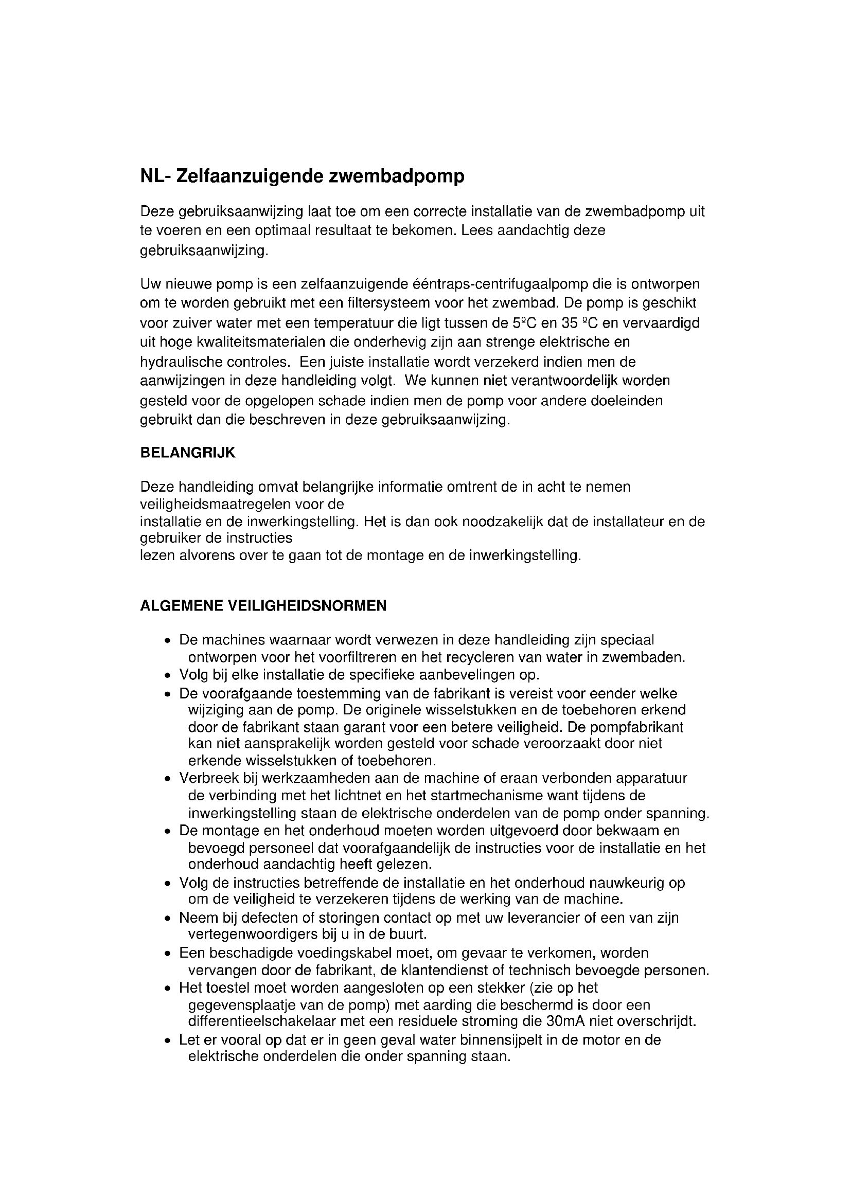 Uw neue pomp is een zelfaanzuiigende eentreaps-centrifugaalpomp die is ontworpen om te worden gebruikt met een filtersystem voor het zwembad. De pomp is geschikt voor zuiver water met een temperatuur die ligtussen de 5^ en 35^ en vervaardigduit hoge kwaliteitsmaterialen die onderhevig�n aan strenge elektrische en hydraulische controles. Een juiste installmentie wordt verzekerd indien men de aanwijzingen in deze handleiding volgt. We konnen Niet verantwoordelijk worden gesteld voor de opgelopen schade indien men de pomp voor andere doeleinden gebruikt dan die beschreiben in deze gebruiksaanwijzing.