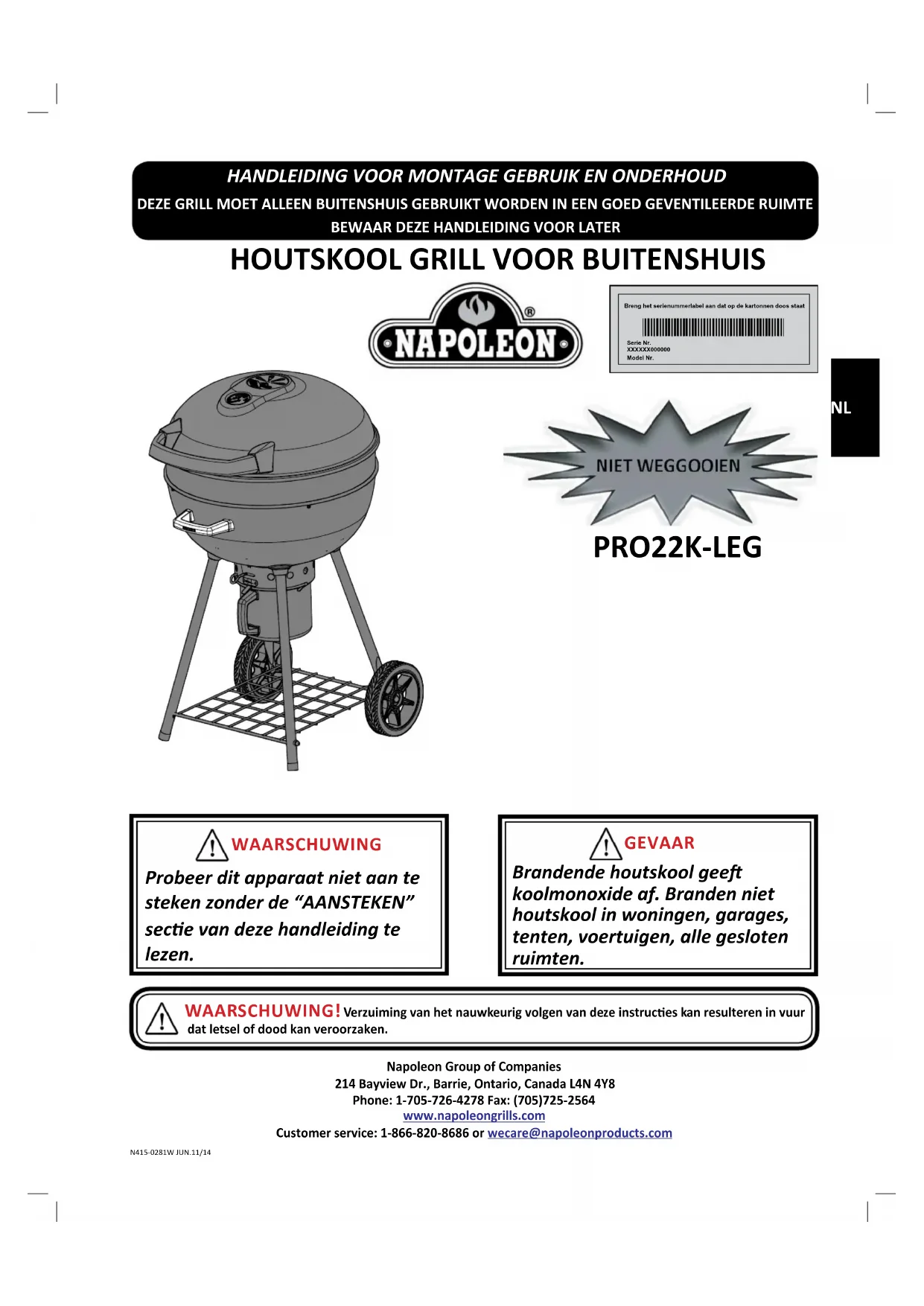 NAPOLEON producten zijn ontworpen met superieure onderdelen en materialen en zijn gemonteerd door goed opgeleide vaklieden die trots op hun werk zijn. Deze grill is grondig geïnspecteerd door een gekwaliceerde technicus voor het verpakken en verzenden, om ervoor te zorgen dat u, de klant, een kwaliteitsproduct ontvangt dat u verwacht van Napoleon. Wij bij Napoleon zijn gewijd aan u, “onze gewaardeerde klant”. Het is ons doel om u te voorzien van het nodige gereedschap voor een onvergetelijke grill ervaring. Deze handleiding is bijgesloten om u te helpen te verzekeren dat uw nieuwe grill juist gemonteerd, geïnstalleerd, onderhouden en verzorgd wordt. Het is belangrijk om deze hele handleiding te lezen en te begrijpen voordat u uw nieuwe grill gaat gebruiken en om ervoor te zorgen dat u volledig op de hoogte bent van alle veiligheidsvoorschrien en mogelijkheden van uw grill. Door het zorgvuldig opvolgen van deze instruces, zult u genieten van jaren probleemloos grillen. Als dit product niet aan uw verwachngen voldoen, om welke reden dan ook, bel onze klantenservice afdeling op 1-866-820-8686 tussen 9 uur en 5 uur (GMT-5) of bezoek onze website op www.napoleongrills.com.
