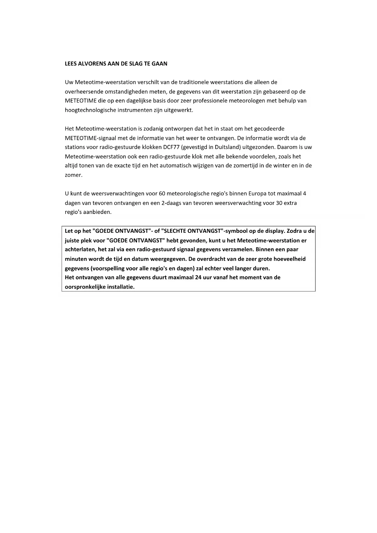 WM5300LEES ALVORENS AAN DE SLAG TE GAAN Uw Meteotime-weerstation verschilt van de traditionele weerstations die alleen de overheersende omstandigheden meten, de gegevens van dit weerstation zijn gebaseerd op de METEOTIME die op een dagelijkse basis door zeer professionele meteorologen met behulp van hoogtechnologische instrumenten zijn uitgewerkt. Het Meteotime-weerstation is zodanig ontworpen dat het in staat om het gecodeerde METEOTIME-signaal met de informatie van het weer te ontvangen. De informatie wordt via de stations voor radio-gestuurde klokken DCF77 (gevestigd in Duitsland) uitgezonden. Daarom is uw Meteotime-weerstation ook een radio-gestuurde klok met alle bekende voordelen, zoals het altijd tonen van de exacte tijd en het automatisch wijzigen van de zomertijd in de winter en in de zomer. U kunt de weersverwachtingen voor 60 meteorologische regio's binnen Europa tot maximaal 4 dagen van tevoren ontvangen en een 2-daags van tevoren weersverwachting voor 30 extra regio's aanbieden. Let op het "GOEDE ONTVANGST"- of "SLECHTE ONTVANGST"-symbool op de display. Zodra u de juiste plek voor "GOEDE ONTVANGST" hebt gevonden, kunt u het Meteotime-weerstation er achterlaten, het zal via een radio-gestuurd signaal gegevens verzamelen. Binnen een paar minuten wordt de tijd en datum weergegeven. De overdracht van de zeer grote hoeveelheid gegevens (voorspelling voor alle regio's en dagen) zal echter veel langer duren. Het ontvangen van alle gegevens duurt maximaal 24 uur vanaf het moment van de oorspronkelijke installatie.KENMERKEN Dit pakket wordt geleverd met een apparaat dat uit het Meteotime-weerstation en een externe buitensensor Thermo-hygrometer bestaat. Dit Meteotime-weerstation is voorzien van de thermo-hygrometersensor om de binnentemperatuur en -vochtigheid te meten en heeft ook een draadloze buiten thermo-hygrometersensor voor het meten van de buitentemperatuur en -vochtigheid. Toetsfuncties: