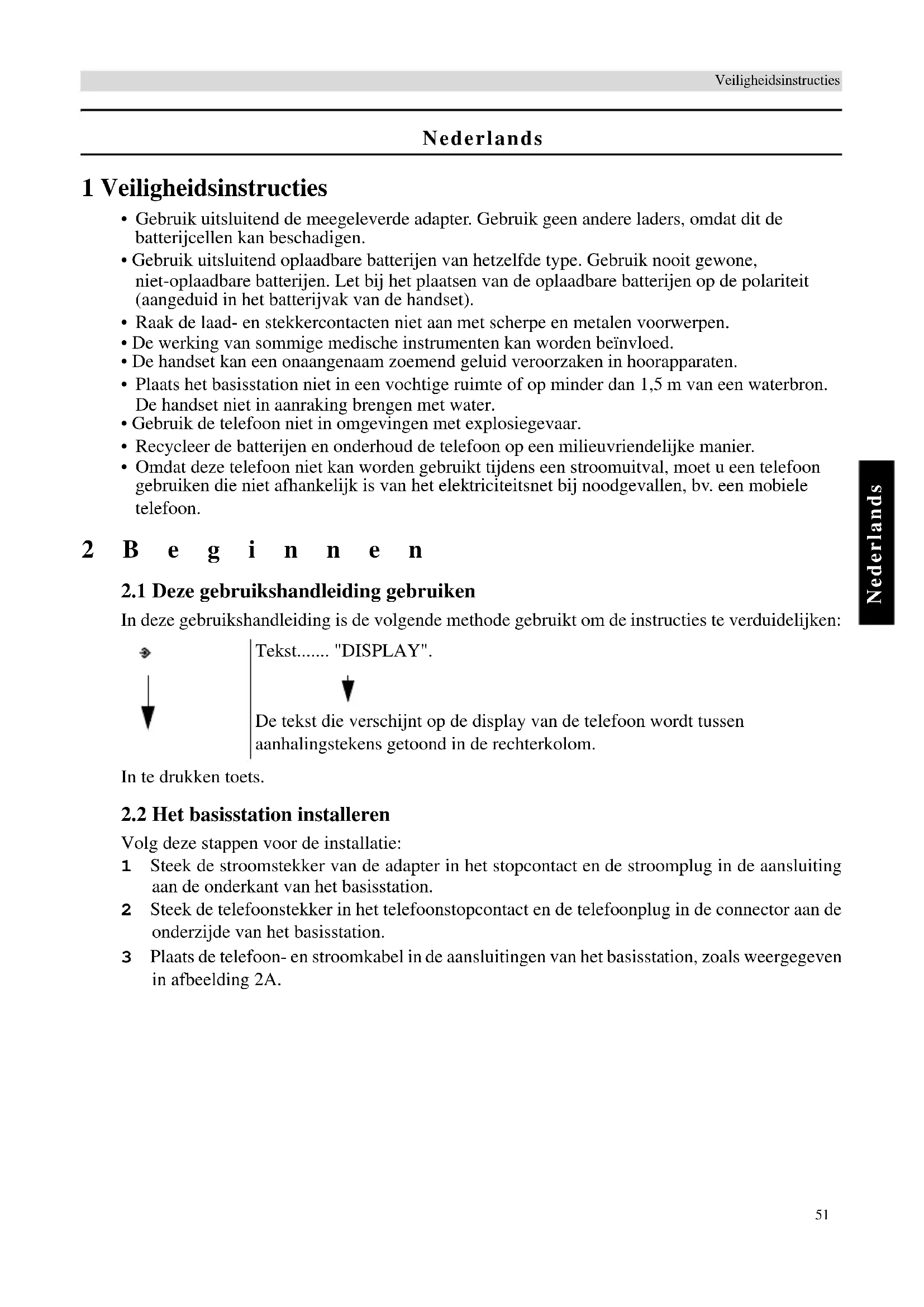 Dit toestel mag uitsluitend gebruikt worden met herlaadbare batterijen. Indien U de meegeleverde batterijen wenst te verrangen要去 U nagaan of de gebruekte batterijen wel geschickt en herlaadbaar zich. In GEEN enkel geval mogen Alkaline batterijen in de handsets gebruikt worden. Indien U Alkaline batterijen gebruikt en de handset op de basis plaatst, dan zullen deze batterijen opwarmen en möglichk exploderen. Eventuele schade die hierdoor ontstaat is nicht verhaalhaar op de fabrikant en tevens is de schade aan het toestel Niet gedekt door de garantievoorwaarden. Eventuele herstel Kosten zullen U aangerekend worden.