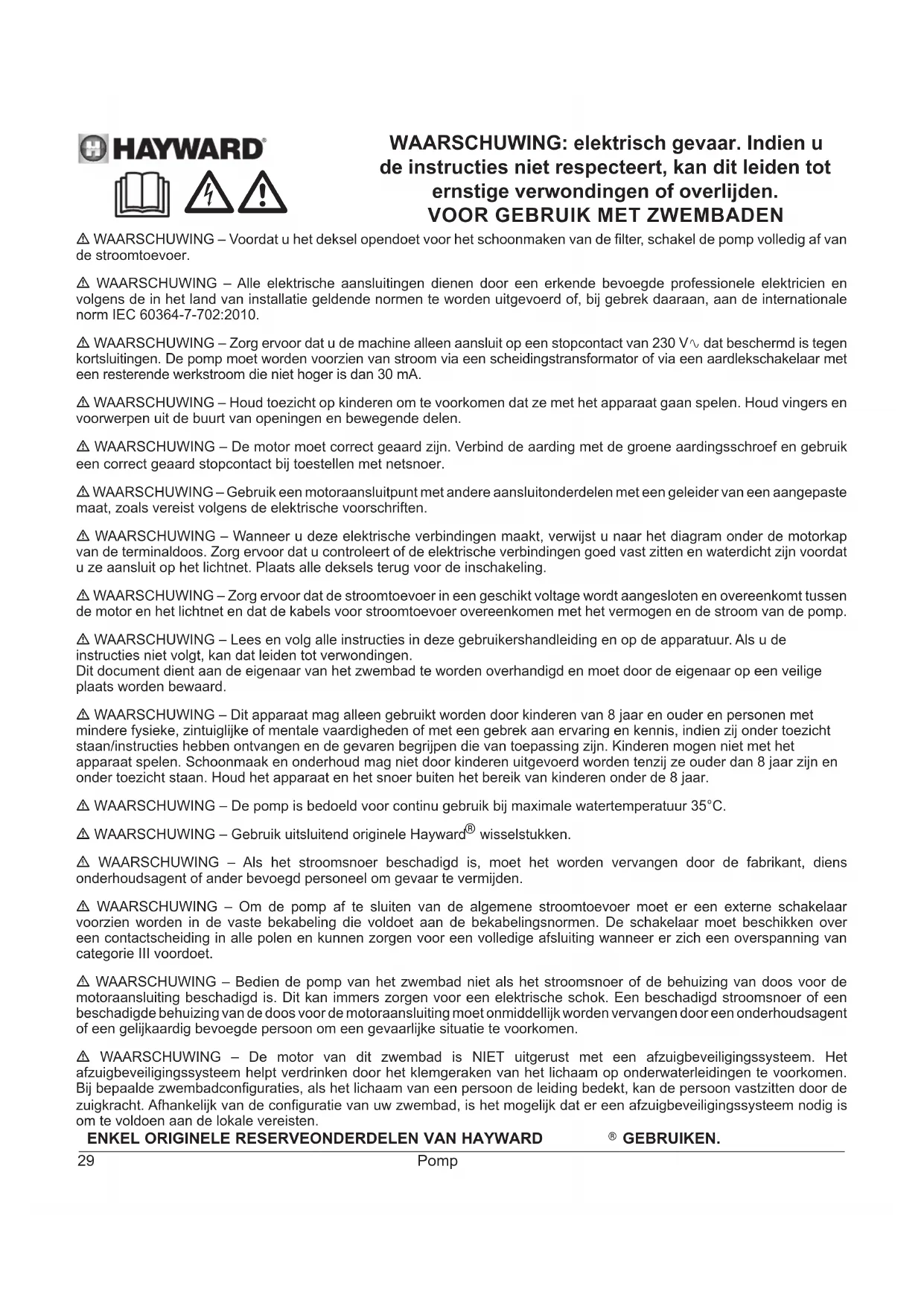 - WAARSCHUWING – Gebruik uitsluitend originele Hayward