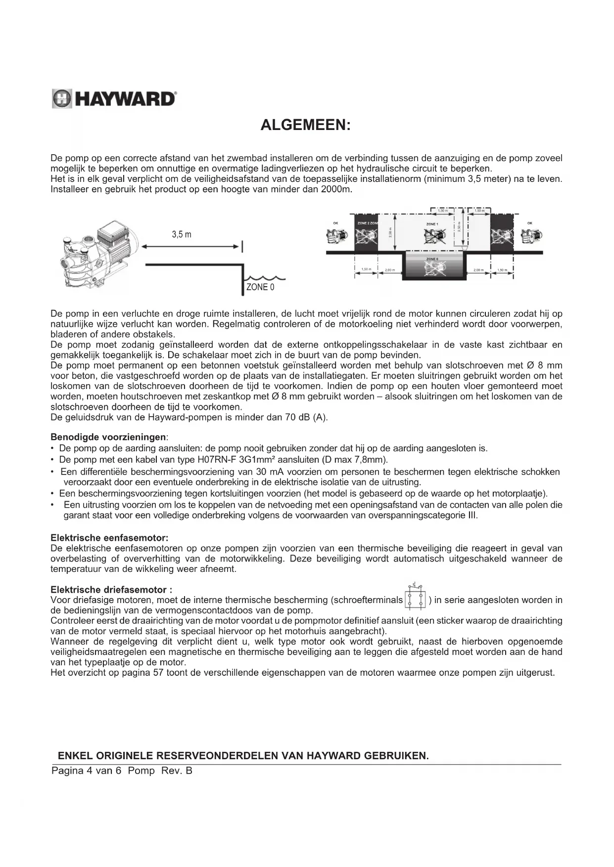 Voor uw informatie Opmerking REGISTRATIEENKEL ORIGINELE RESERVEONDERDELEN VAN HAYWARD GEBRUIKEN. Pagina 4 van 6 Pomp Rev. B ALGEMEEN: De pomp op een correcte afstand van het zwembad installeren om de verbinding tussen de aanzuiging en de pomp zoveel mogelijk te beperken om onnuttige en overmatige ladingverliezen op het hydraulische circuit te beperken. Het is in elk geval verplicht om de veiligheidsafstand van de toepasselijke installatienorm (minimum 3,5 meter) na te leven. Installeer en gebruik het product op een hoogte van minder dan 2000m. ZONE 2 ZONE 2 ZONE 0 1,50 m 2,50 m 2,50 m 1,50 m 2,00 m 2,00 m 1,50 m ZONE 1 1,50 m