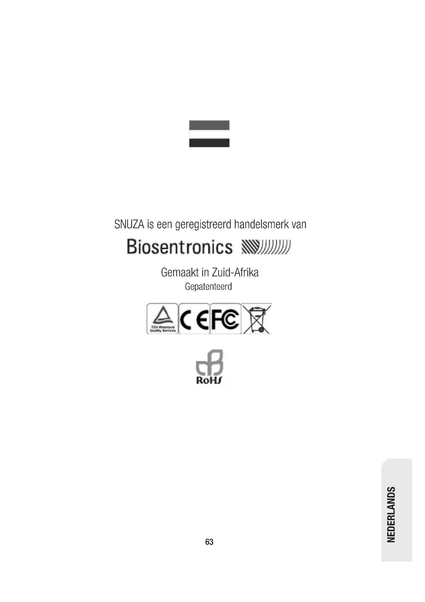 Klanten gebruiken deze monitor op eigén risico en Biosentronics cc, waar leden, medewerkers, agenten, contractoren, vertegenwoordigers, fabrikanten, distributeurs en partners ("SNUZA") zullen nicht aansprakelijk worden gesteld voor enig verlies, enige schade of verwonding geleden door de klant of enig ander persoon, voortkomend uit of in verband met het gebruik of de fabricage van de monitor, inclusief verlies, schade of verwonding geleden door de klant of enig ander persoon als gevolg van defecten met betrekking tot de monitor, en alle garanties en enige andere aansprakelijkheid die uit wat voor oorzaak